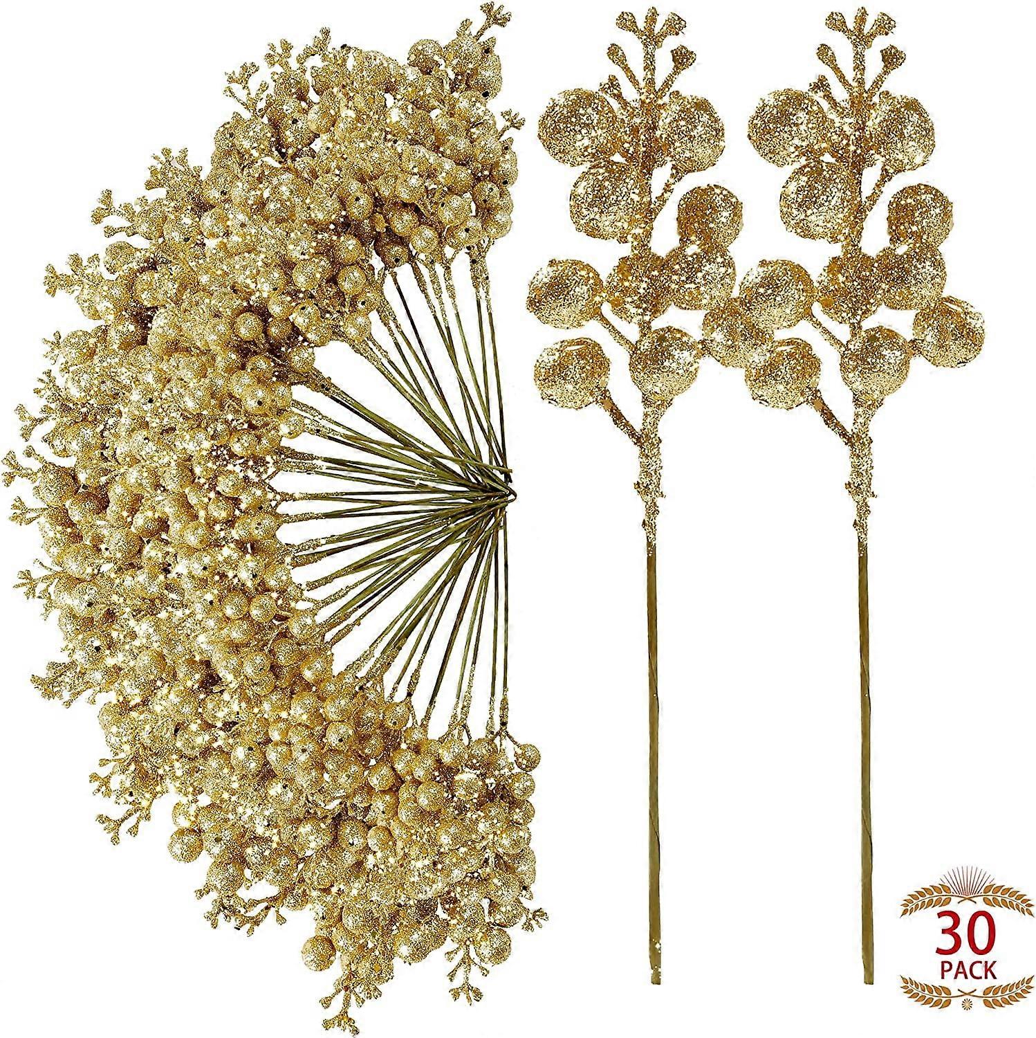 30Pcs Christmas Glitter Berries Stems, Red Berry Branches Holly Picks for DIY Xmas Wreath, Tree Ornaments, Holiday Home Decor Gifts (Red)