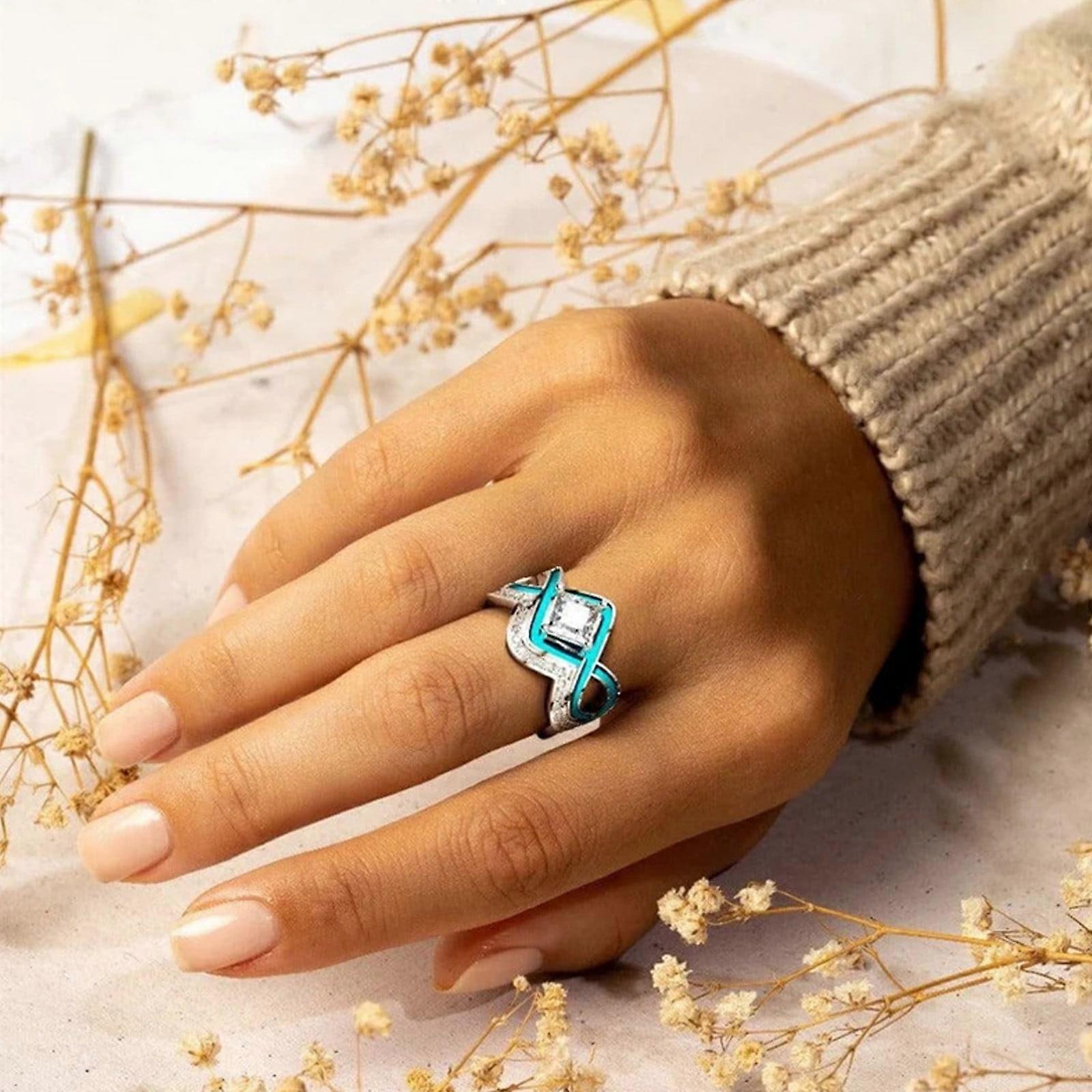 Clearance: 2Pc Turquoise Stackable Rings for Women, Ocean Blue Enamel Wave & Square Crystal Ring Set, Size 11