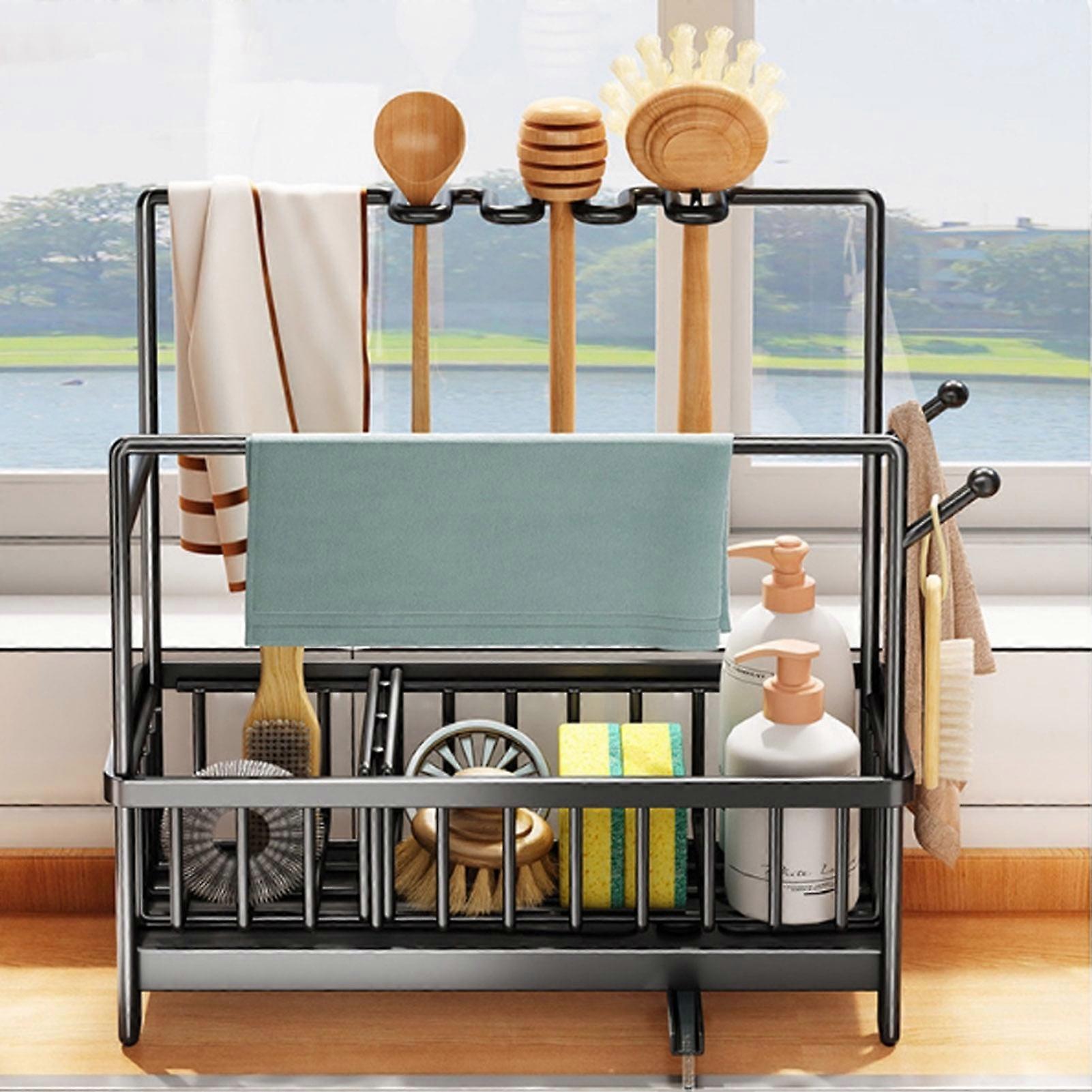 SUSUchens Kitchen Sink Organizer Storage Rack with Removable Drain Tray Easy Access Multi-Functional Towel Holder Brush Drainer Rack Black Size A