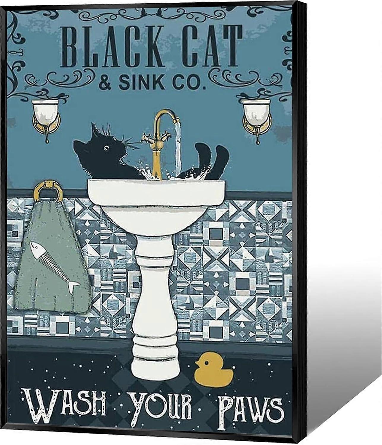 Funny Cat Bathroom Canvas Art - Black Cat Wash Your Paws Poster, Vintage Bathtub Cat Wall Decor for Toilet, Farmhouse 12x16" Unframed