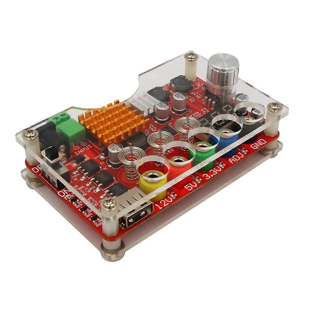 ATX DC Power Supply Breakout Distribution Board with Acrylic Housing Kit Module Adapter Power Connector Supports 3.3V/5V/12V 1.8V-10.8V  _x005f_x000D_ Feature: _x005f_x000D_ 1. PARAMETER-input voltage range DC 13V-24V; output voltage range 1.8V-10.8V (ADJ) maximum output current 3A, stable voltage: 3.3V/5V/12V _x005f_x000D_ 2. DISPLAY -LED displays the input/output voltage through the touch sensor switch _x005f_x000D_ 3. ADJUSTABLE OUTPUT -The output voltage can be adjusted by the voltage knob _x005f_x000D_ 4. ON/OFF SWITCHABLE OUTPUT -The output voltage can be turned on/off by touching the sensor switch, when the output is turned off, the screen will display OFF _x005f_x000D_ 5. PROTECTION-input reverse connection protection; short circuit protection _x005f_x000D_ 6. At the same time, the voltage plate is also equipped with an acrylic shell kit, which is convenient to use. _x005f_x000D_ _x005f_x000D_ Specification: _x005f_x000D_ Size: 99*60mm/3.92*2.36in _x005f_x000D_ _x005f_x000D_ Note: _x005f_x000D_ Due to the different monitor and light effect, the actual color of the item might be slightly different from the color showed on the pictures. Thank you! _x005f_x000D_ Please allow 1-2cm measuring deviation due to manual measurement. _x005f_x000D_ _x005f_x000D_ Included: _x005f_x000D_ 1 X ATX Power Distribution Board _x005f_x000D_ 5 X Male Plugs _x005f_x000D_ 1 X Screwdriver 1. PARAMETER-input voltage range DC 13V-24V; output voltage range 1.8V-10.8V (ADJ) maximum output current 3A, stable voltage: 3.3V/5V/12V 2. DISPLAY -LED displays the input/output voltage through the touch sensor switch 3. ADJUSTABLE OUTPUT -The output voltage can be adjusted by the voltage knob 4. ON/OFF SWITCHABLE OUTPUT -The output voltage can be turned on/off by touching the sensor switch, when the output is turned off, the screen will display OFF 5. PROTECTION-input reverse connection protection; short circuit protection