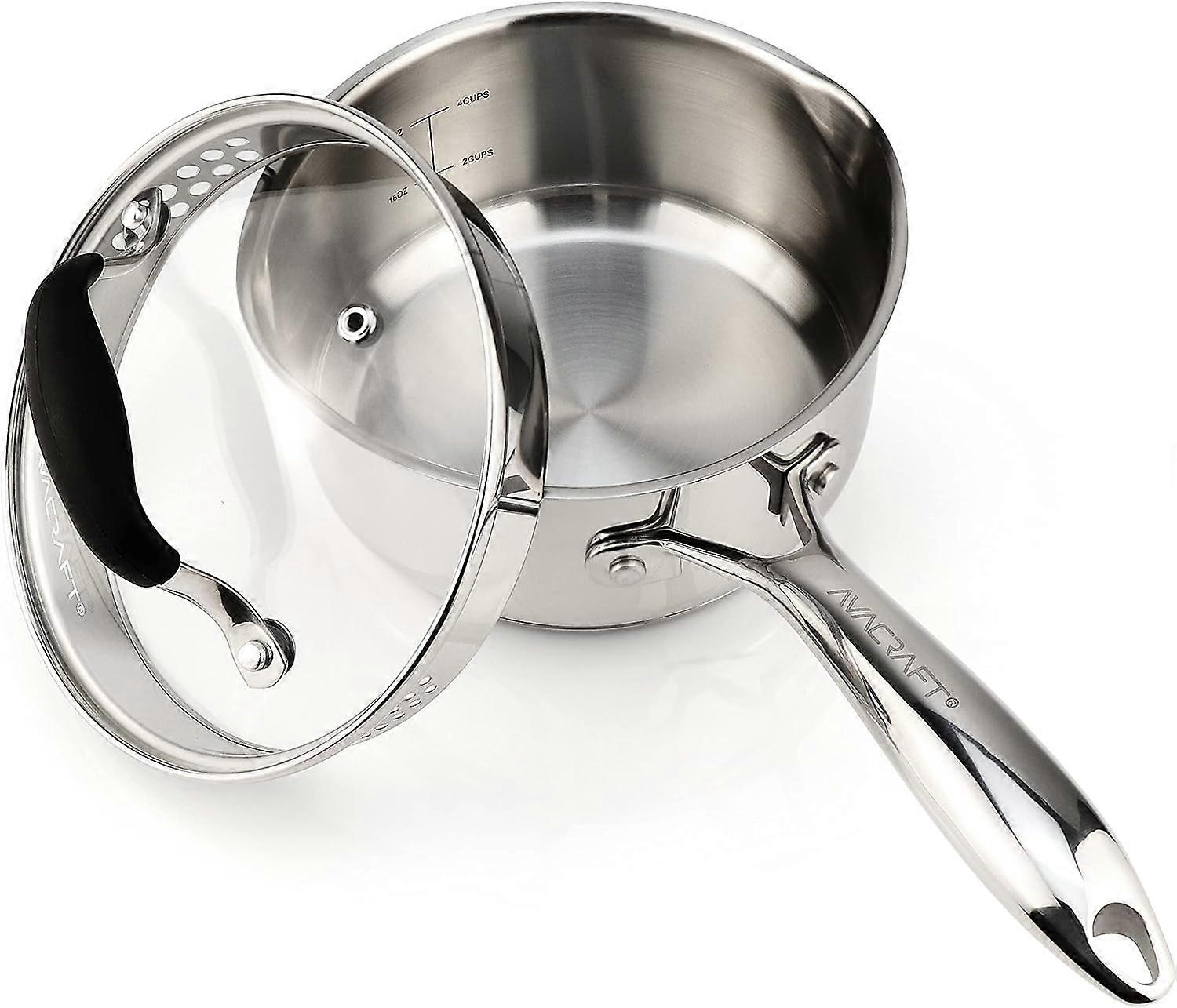 Stainless Steel Saucepan 3.5 Qt with Glass & Strainer Lid, Two Spouts, Ergonomic Handle, Tri-Ply Bottom