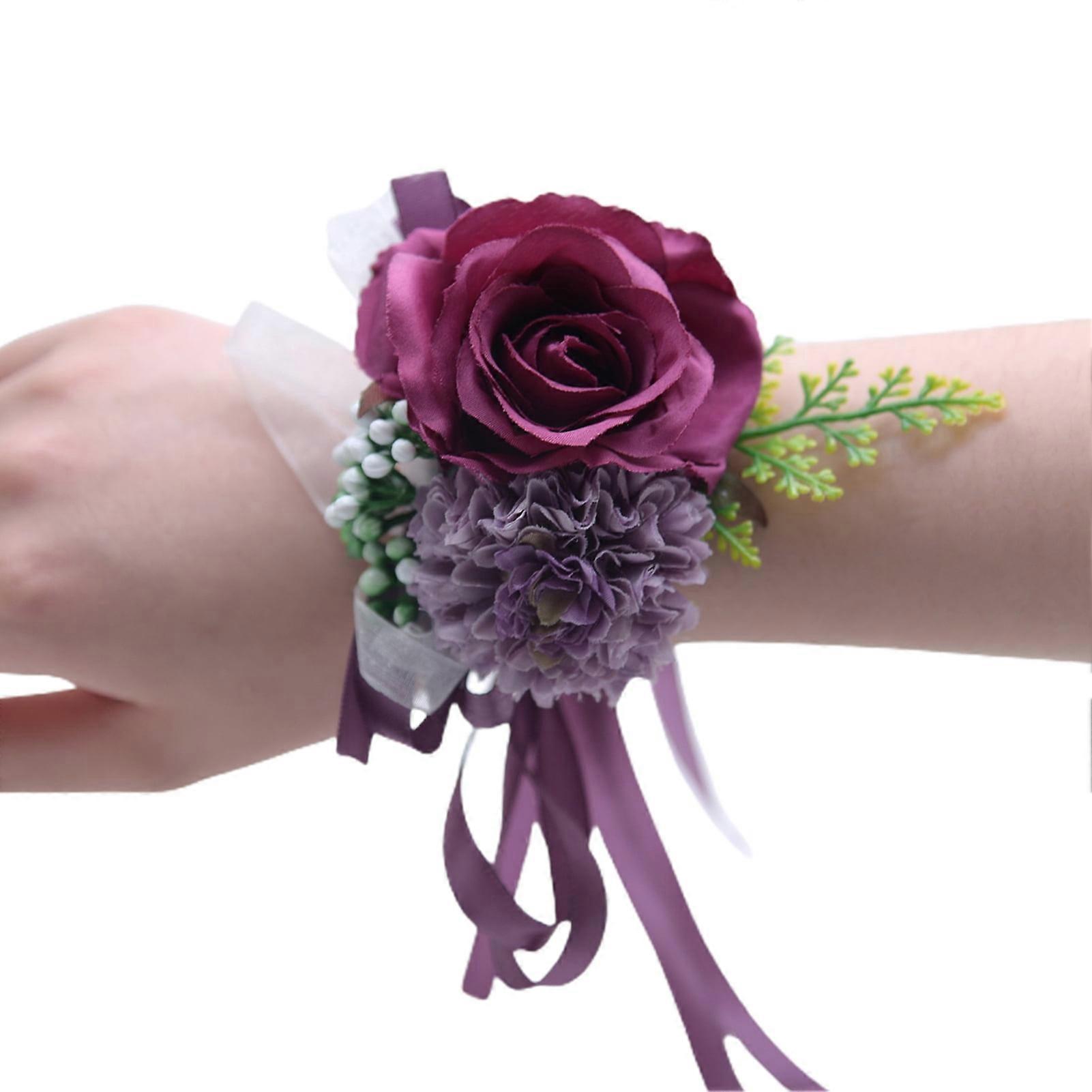 Farfi Wrist Flower Non-Fading Multi-color Decorate Elegant Bride Groom Fake Wrist Corsage for Party (Dark Purple)