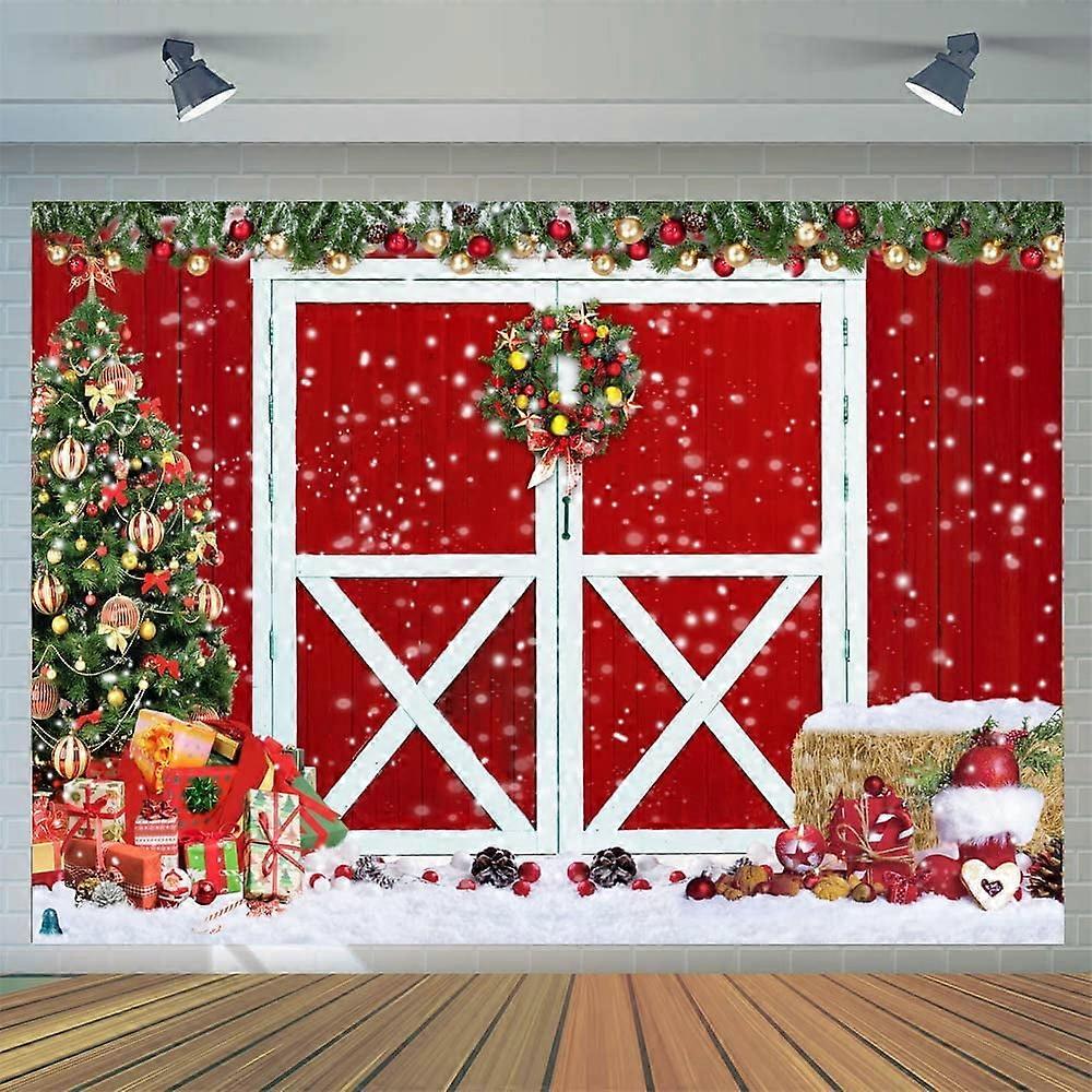 7x5ft Christmas Photography Backdrop Christmas Barn Red Wood Door Backdrop for Photography Xmas Tree Snow Gift