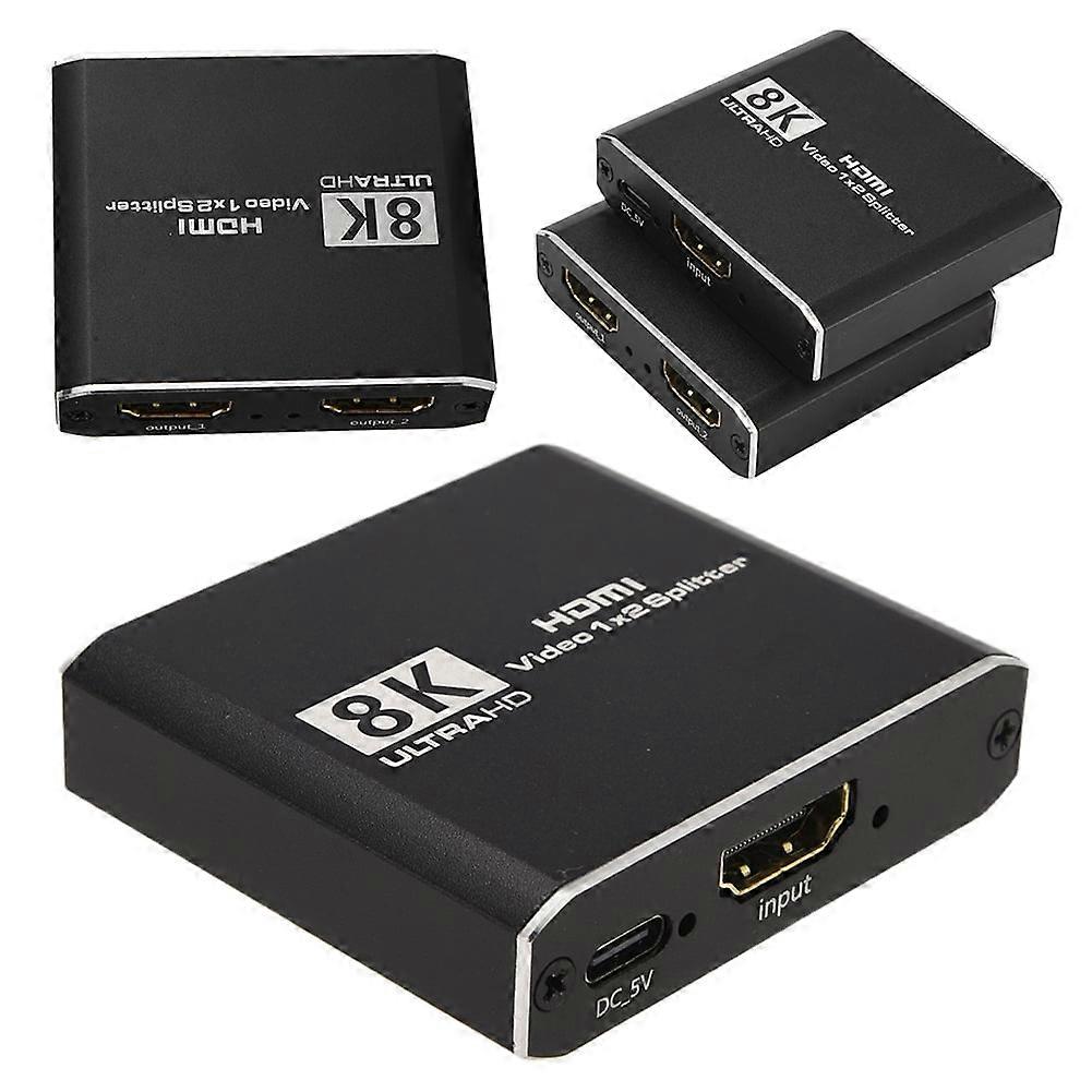 Specification: _x005f_x000D_ Origin: Mainland China _x005f_x000D_ Gender: Female-Female _x005f_x000D_ Connector A: HDMI _x005f_x000D_ External Power Source: Yes _x005f_x000D_ Connector B: HDMI*2 _x005f_x000D_ Package: Yes _x005f_x000D_ Suitable for: set-top boxes, game consoles, computers _x005f_x000D_ Color: black _x005f_x000D_ Material: aluminum shell _x005f_x000D_ Product weight: 53g _x005f_x000D_ Package weight: 120g _x005f_x000D_ Product size: 58.00x52.00x15.00mm/2.28x2.05x0.59inch _x005f_x000D_ Packing size: 130*93*25mm/5.12*3.66*0.98 inch _x005f_x000D_ _x005f_x000D_ _x005f_x000D_ Note: _x005f_x000D_ Due to the different monitor and light effect, the actual color of the item might be slightly different from the color showed on the pictures. Thank you! _x005f_x000D_ Please allow 1-2cm measuring deviation due to manual measurement. _x005f_x000D_ _x005f_x000D_ _x005f_x000D_ _x005f_x000D_ Included: _x005f_x000D_ 1 x Video Splitter _x005f_x000D_ 1 x Type C Power Supply Line _x005f_x000D_ 1 x Manual 1. Dual Signal Splitting: This HDMI port male to 2 female adapter allows you to split one HDMI (V2.1) input signal into two HDMI (V2.1) output signals, providing seamless connectivity for multiple devices. 2. High-Resolution Support: The 1 male to dual HDMI 2 way female adapter supports impressive resolutions including 8K60Hz, 4K120Hz, and 1080P240Hz, ensuring top-quality video performance. 3. 8K HDMI 2.1 Splitter: With the 1 in 2 out converter, you can mirror two screens simultaneously, supporting different resolution monitors for versatile display options. 4. Room-to-Room Display: Easily duplicate your screen to different rooms with the 1 male to 2 HDMI female adapter, ensuring both outputs show the same screen for convenient viewing.