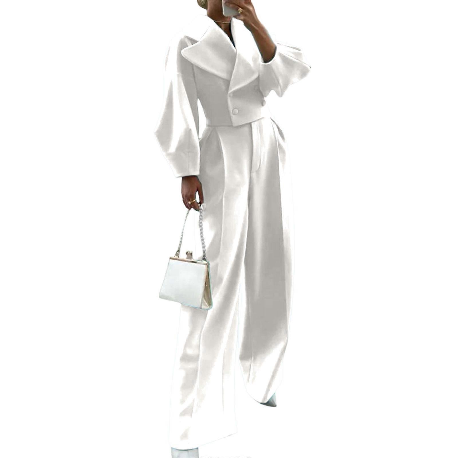 Women's two-piece suit set: double-breasted trench coat with lapel, short blazer, and wide-leg trousers. White XL