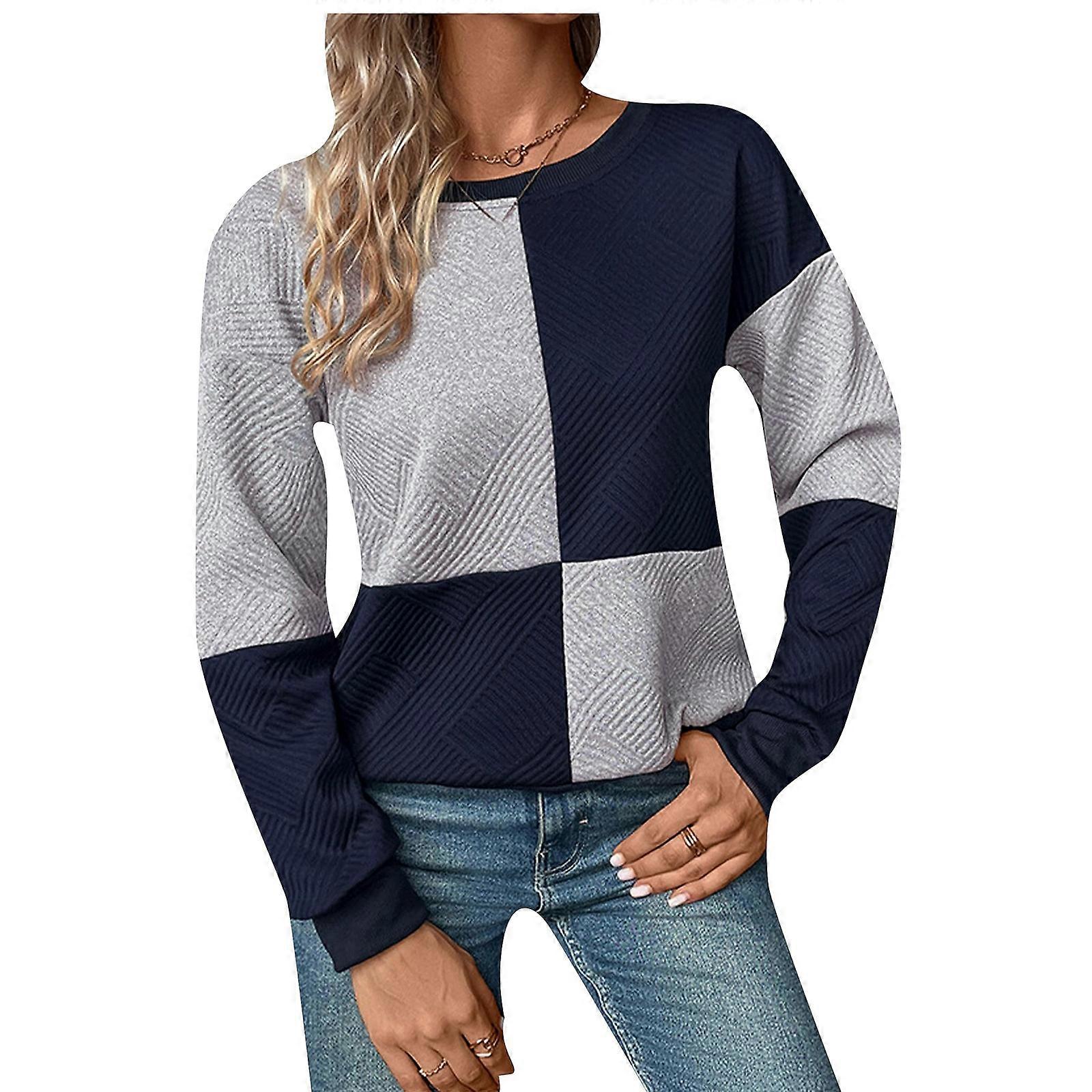 Women's Loose-fitting Long-sleeved Color Block Textured Sweatshirt navy blue XL