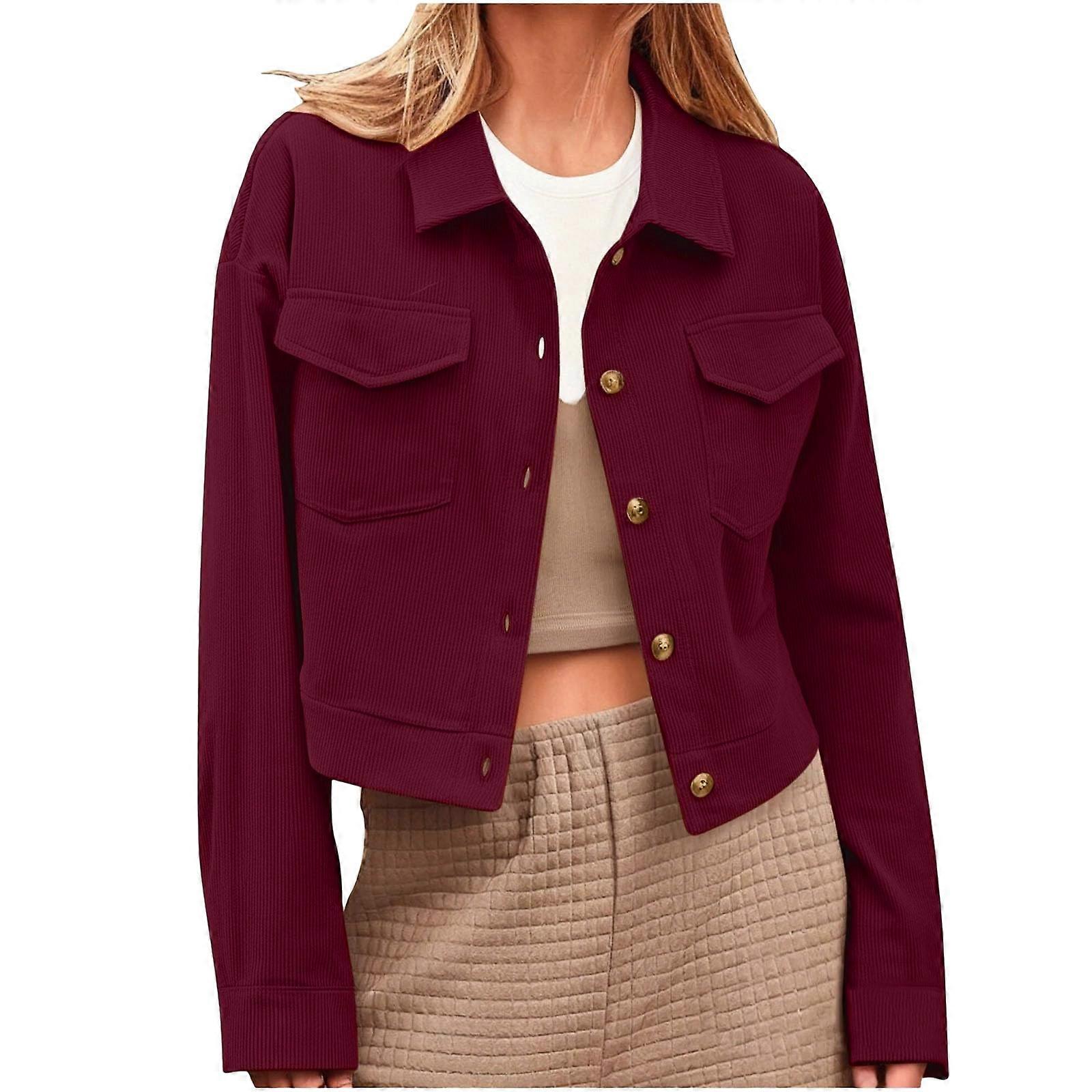 Women's Cropped Jacket - Button-Down Corduroy Cropped Blazer Casual Long Sleeve Cropped Top Burgundy XS