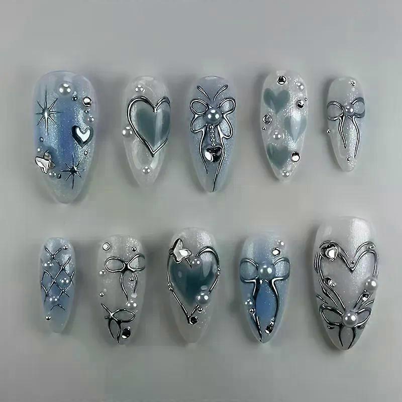 24Pcs Blue Almond Press on Nails with 3D Pearl Design Mid-length Oval False Nails Tips Bow Pattern Wearable Fake Nail for Women