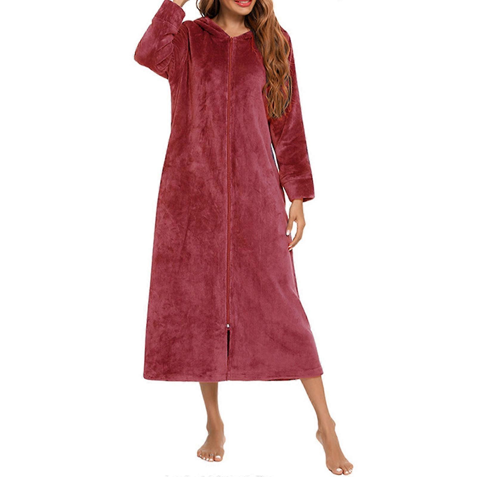 Women's Thickened Polar Fleece Hooded Long Nightgown Burgundy XL