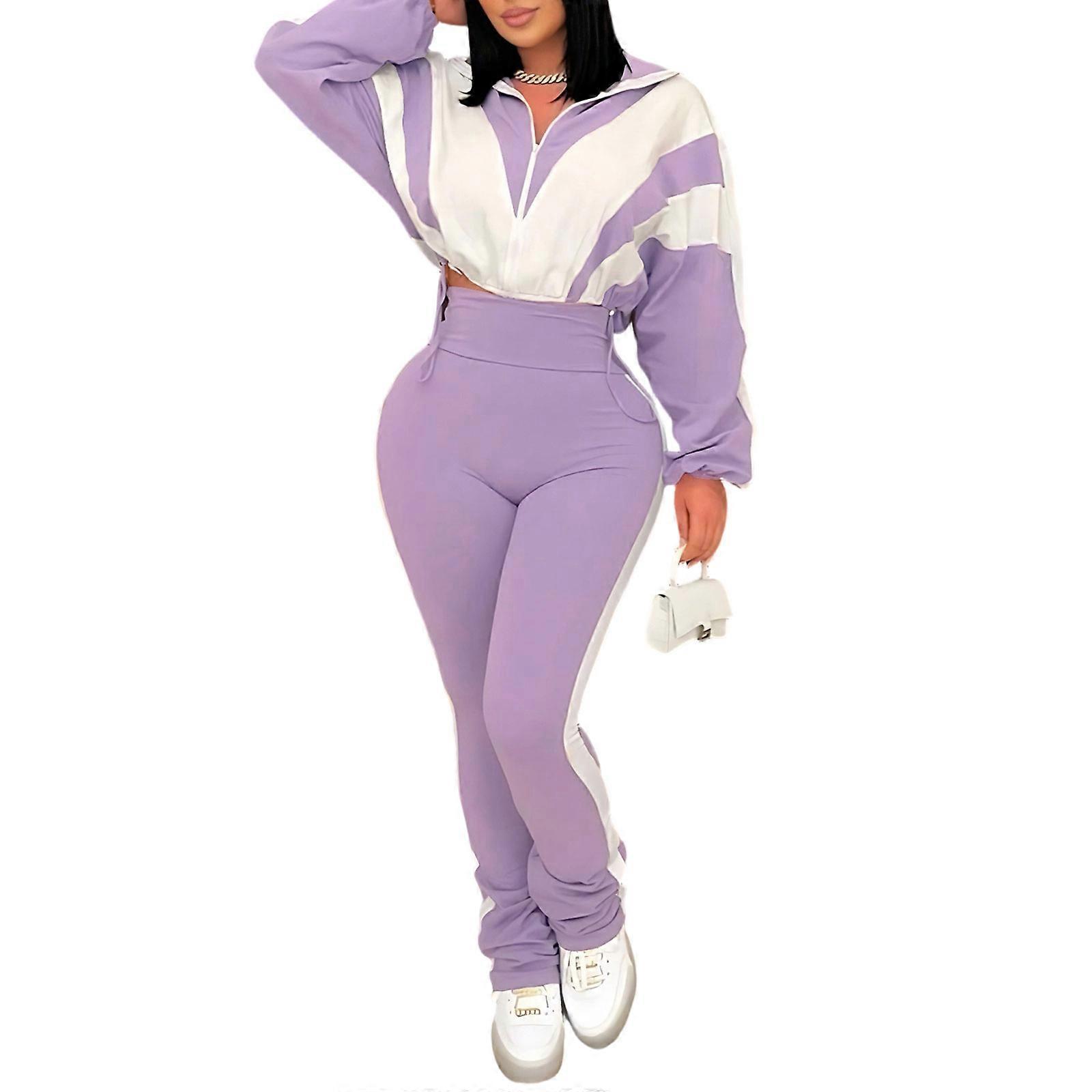Women's two-piece set with contrasting long-sleeved zippered cropped leggings, jogging Purple XL