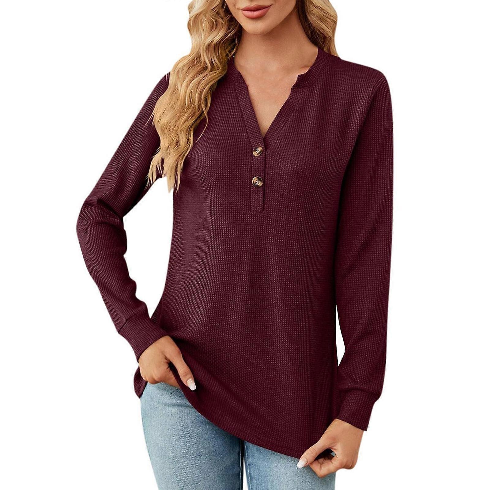 Womens Henley Shirts V Neck Long Sleeve Button Shirt Waffle Knit Tops Burgundy XL