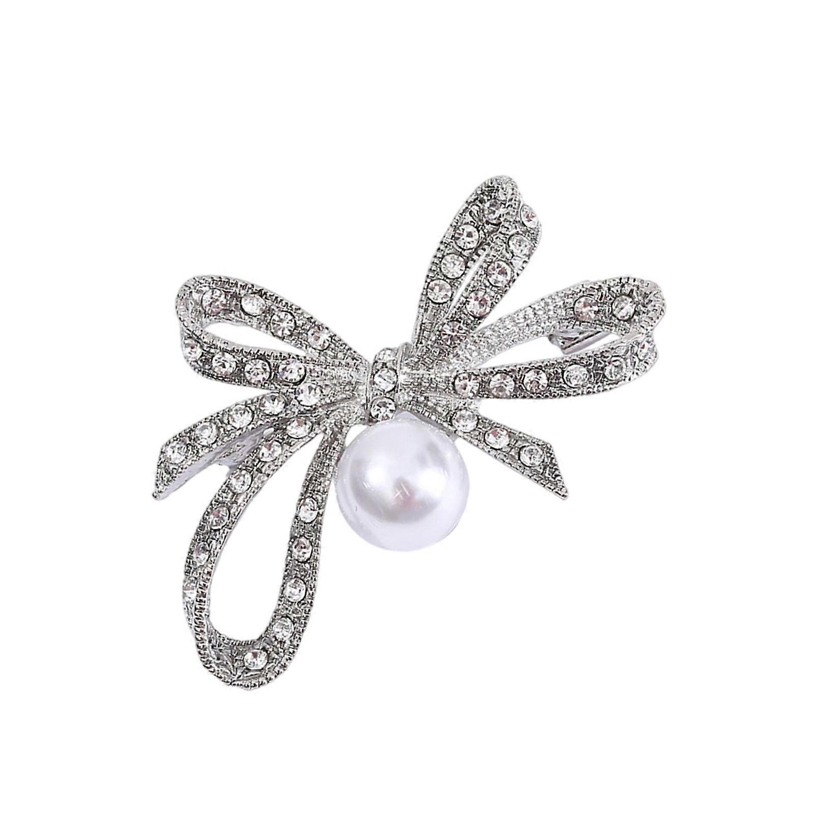 Lovely Bowknot Heart Oval Brooch With Rhinestones Detail, Chest Badge Accessory For Bridal Party And Cocktail Event silver