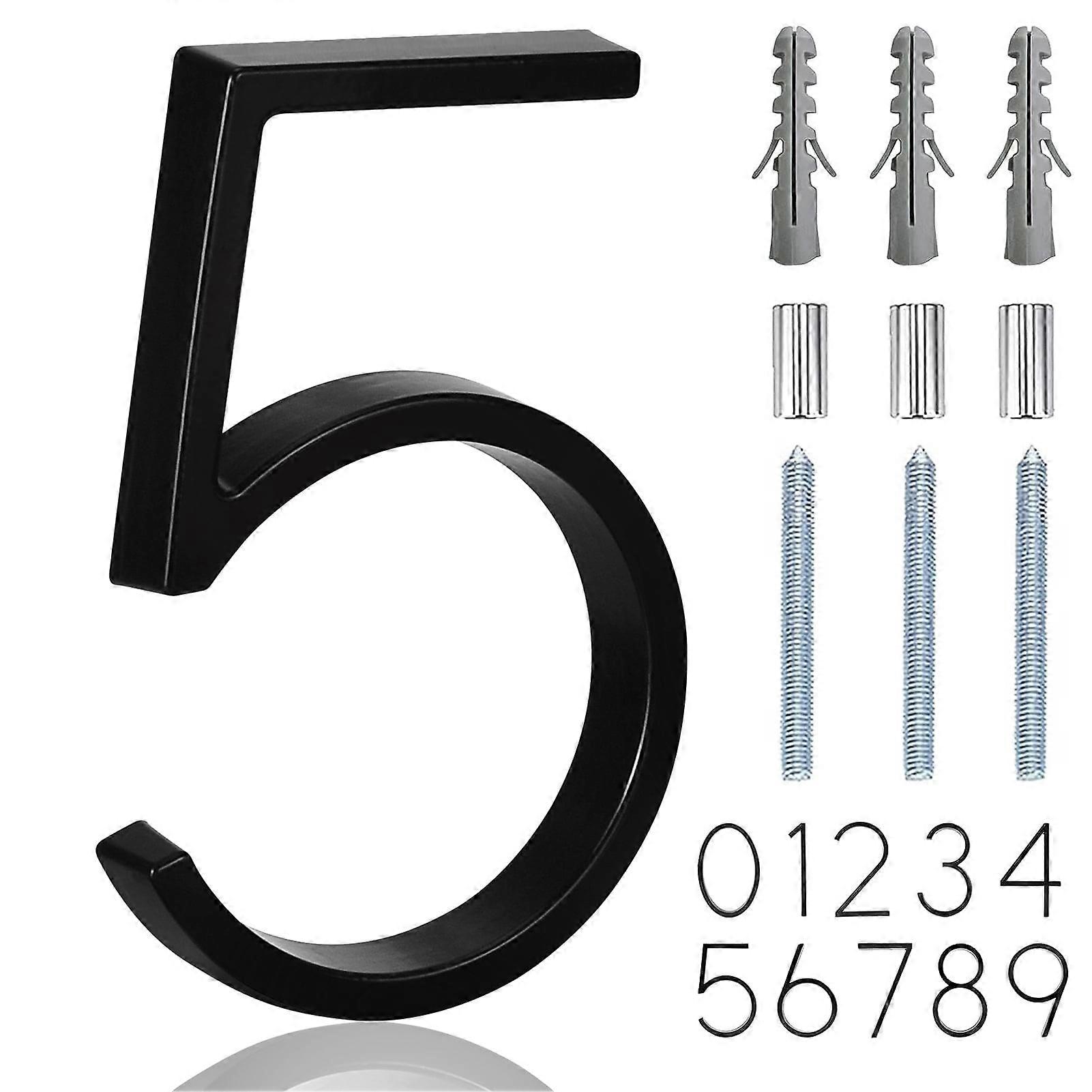 About this item Durable material: This house number is anti-rust, made of zinc alloy, all weather resistant, don’t worry about the house numbers be rust and fade. Easy to install: The house numbers for outside modern is DIY installation, following the instruction, and using the mounting template inside to mark holes, the number is very easy to install. Wide applications: The modern house numbers is suitable for many places, you can install the numbers in any places, such as door, garden, mailbox, fence or so on, and specially in any material wall. Easy to notice: Visibility signage, the black color, floating design and 5 inch size, all make address numbers be very visible, will not ignore numbers for address on house. Package included: You will get one house number and three screws, three expansion tubes, 3 copper tube, and one operating instruction(mounting template) Specification: Size: 5 inch Material: Stainless Steel, Metal, Copper, Zinc Mounting Type: Door Mount Pre-printed: Numbers Product Dimensions: 5.47"L x 3.12"W Easy to read font - classic address numbers will create a good shadow effect after installation, so you can try to focus the light on it to get good night visual effects, And large size meets many 911 community requirements. Ultiple placement options - Mount vertically, horizontally, or at an angle to suit your own creative style; Can be installed with spacers for a floating effect or without for a flush look. Never rust - Number made of quality stainless steel and its shiny surface will add elegance to your home; Furthermore, with a weather-resistant black finish, make numbers heavy-duty and Never rust. Super easy installation - mounting hardware for flush or floating numbers and simplified instructions, you need only pre-drill into the surface then screw in the numbers; installation takes only a matter of minutes. 5 inch high, 0.5 inch thick, They can be widely applied in houses, gardens, mailboxes, streets, etc., reduce the chance of missed deliveries or lost visitors with these large wall mounted address numbers