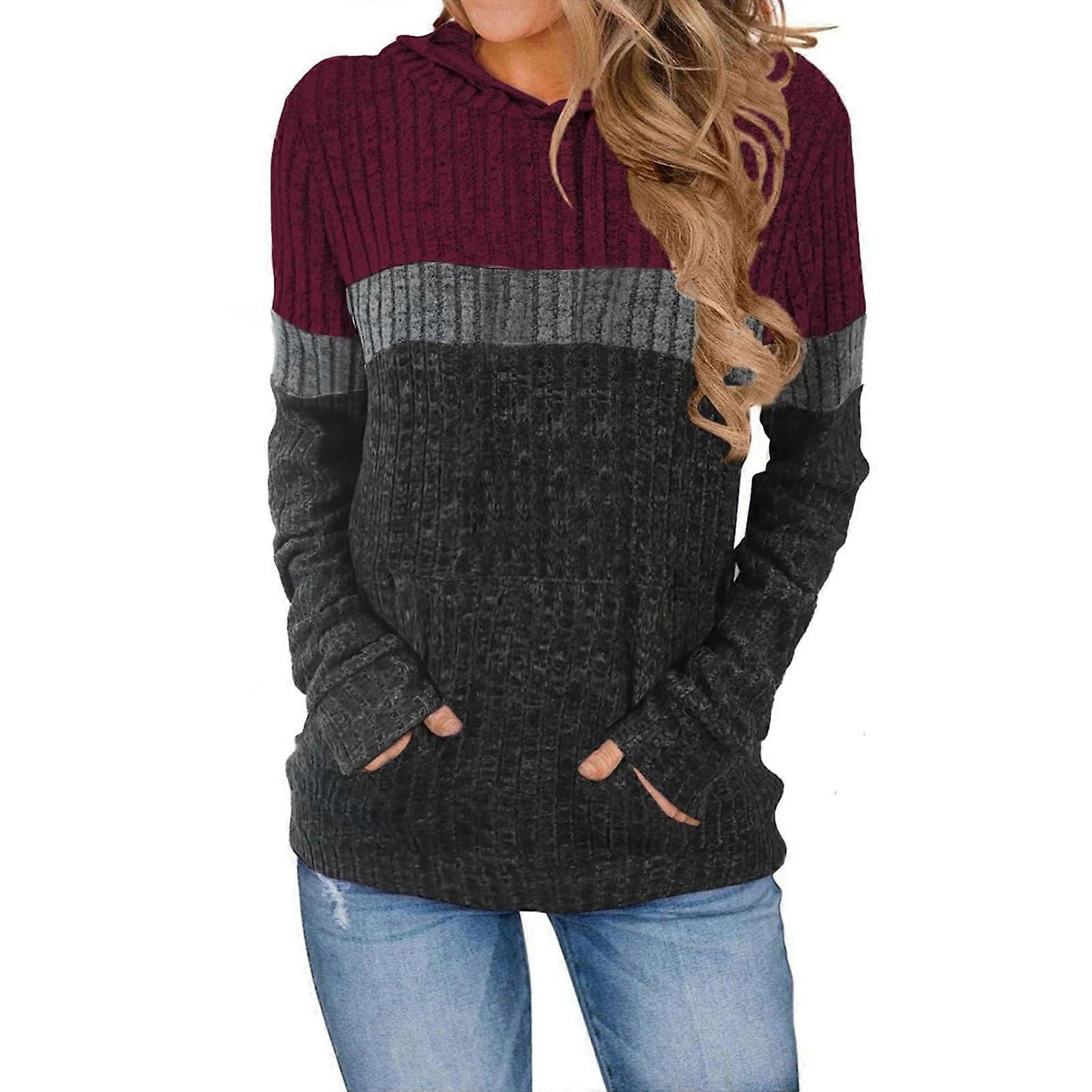 Women's Colorblock Knitted Long Sleeve Casual Pocket Top Burgundy XL