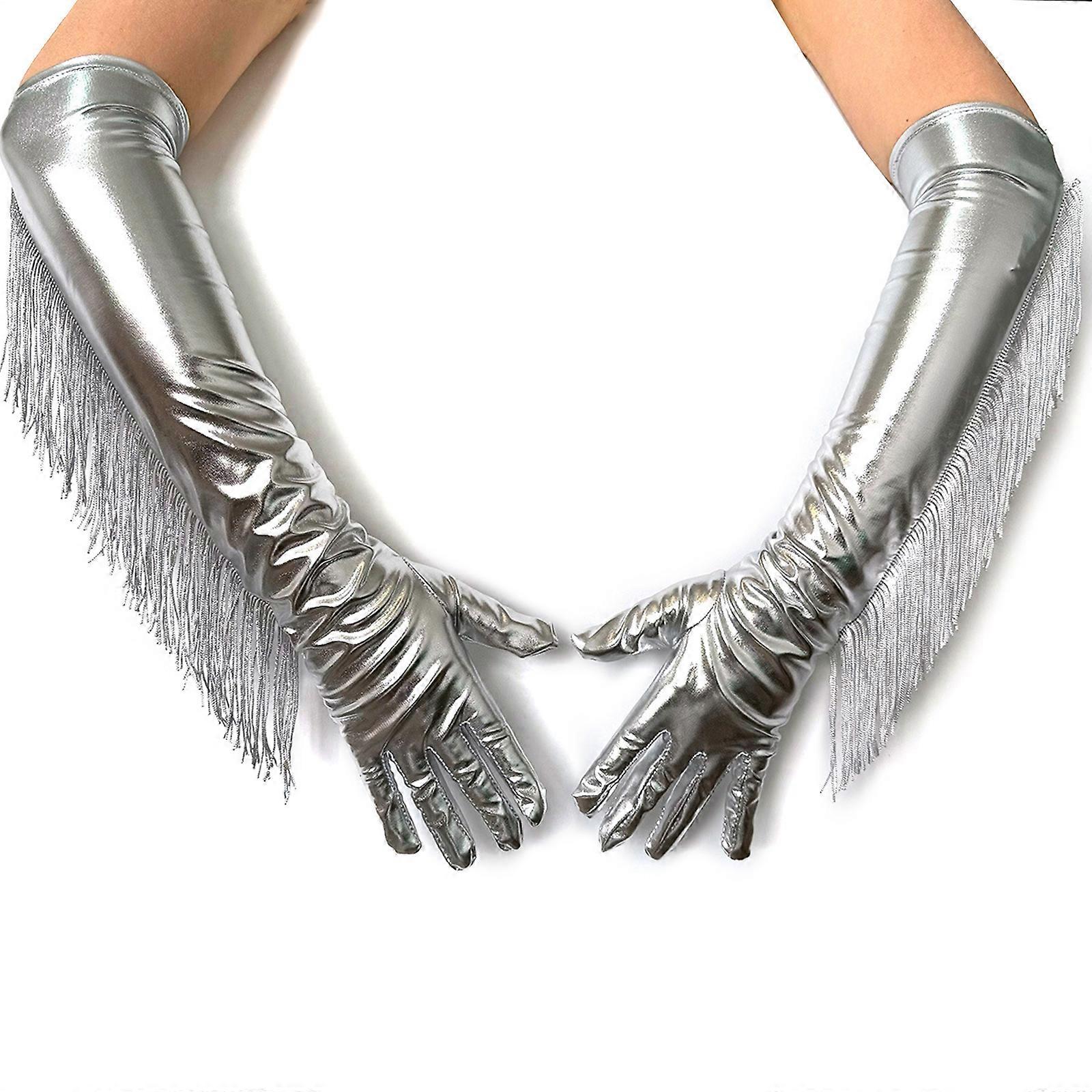 Features: Use selected pu leather, the long silver gloves feature dazzling tassels and a glossy finish for stage show, eye catching appearance at various event. The elbow length design with elegant tassels while enabling effortlessly and unrestricted hand movement. Great for performers, cosplayers, and cosplay enthusiasts searching fashion accessories for stage shows, theme parties, or fashion statement. Elevating your look at 1920s themed galas, Halloween celebration, beauty pageants, cocktail night, or theatrical productions with the shimmering statement gloves. Design to flatter arm shape, this multiuse costume gloves use as elegant gift for cosplay lovers or anyone craving instantly charm. Specifications: Component: pu leather Product Size: Approx. length 48cm/18.9inch Package Includes: 1 Pair Silver tassels Gloves note: Please allow 1-2cm errors due to manual measurement. Due to the differences between different monitors, the picture may not reflect the actual color the item.