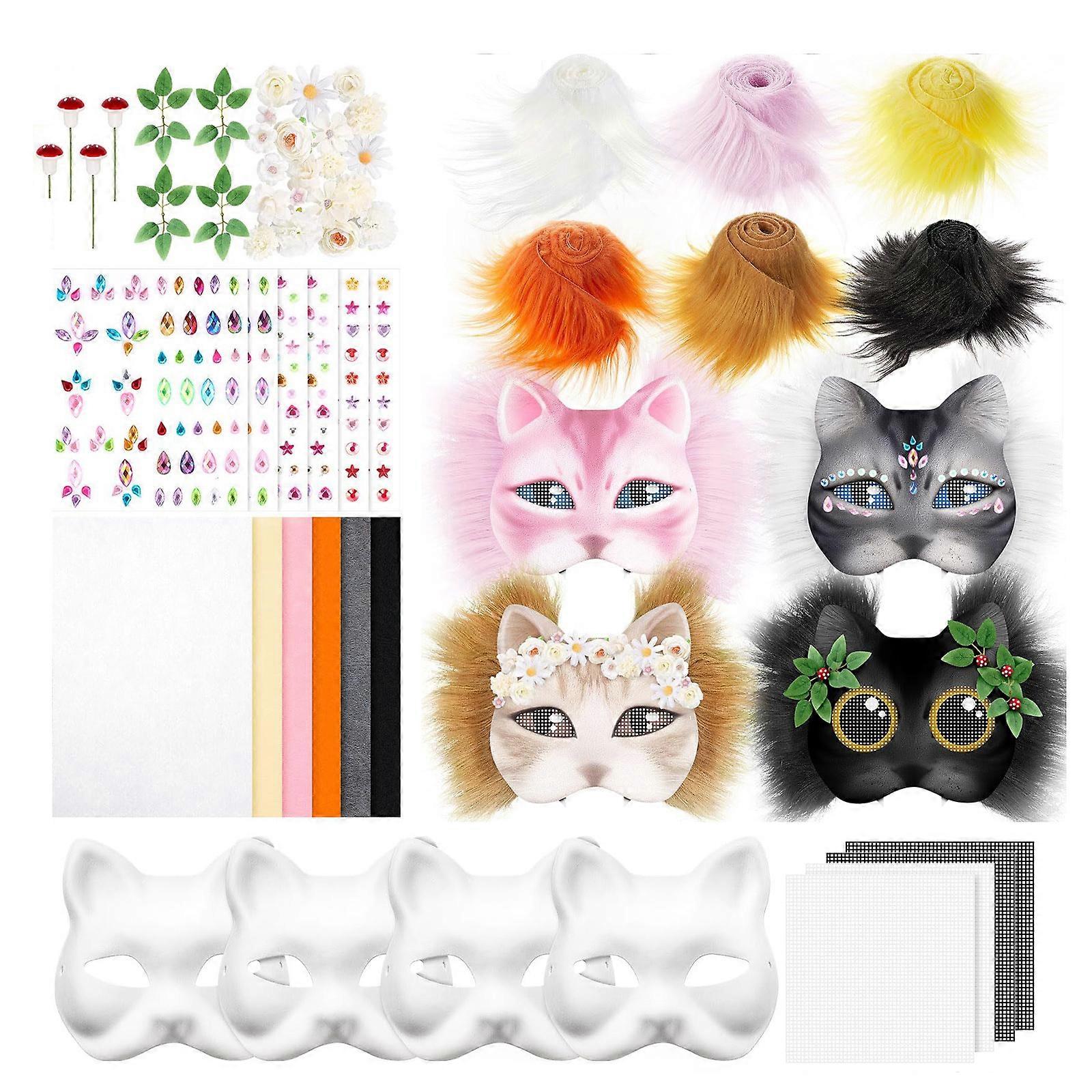 4Pcs Unpainted Cats Mask Set Includes Furry Trim Eye Mesh Sticker Felted Cloth for Painting Unpainted Masquerades Mask Set 2 Box