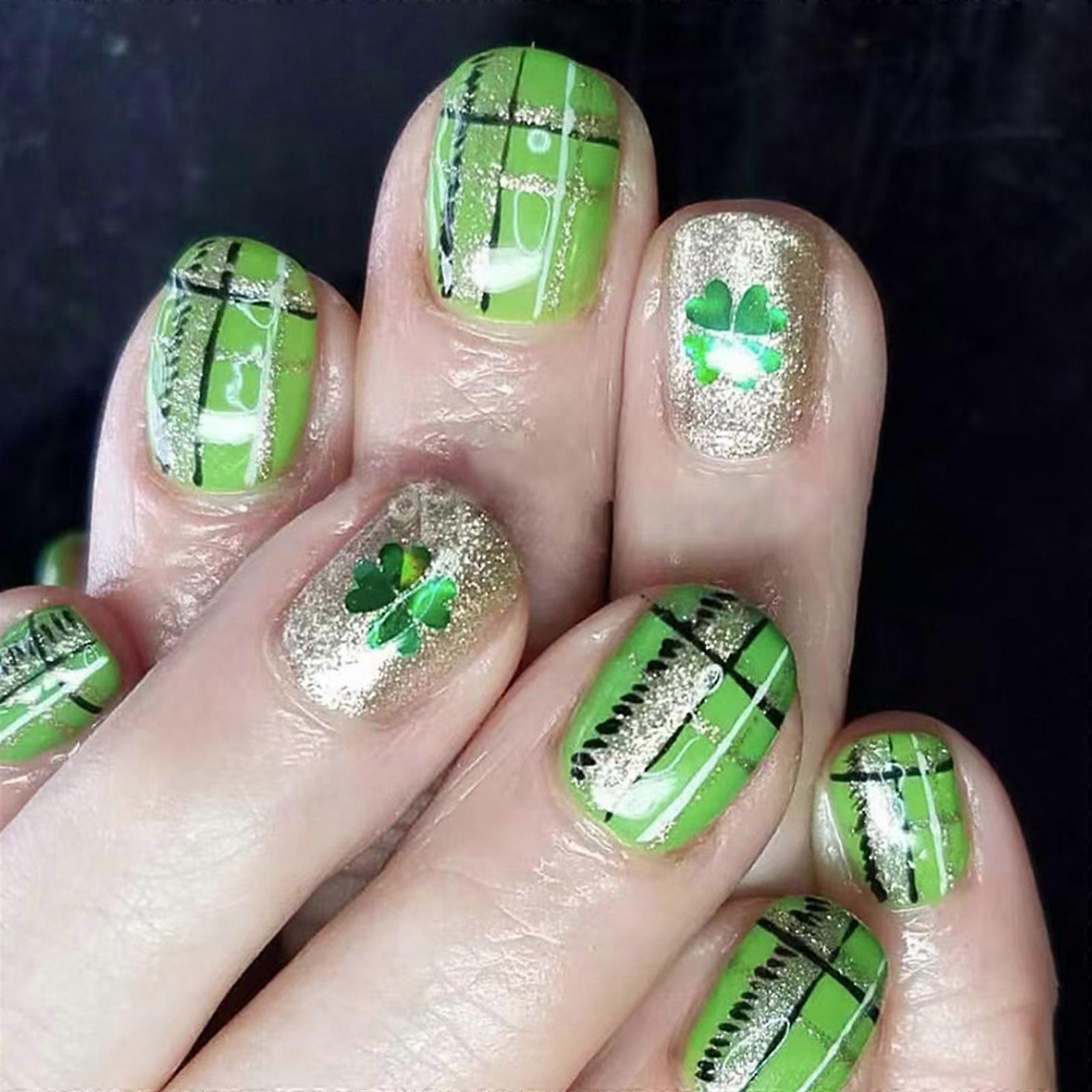 24 Pcs Short Square False Nail Glittering Stick on Nail Saint Patricks Day Press On Nail Shamrocks Artificial Nail Multicolor