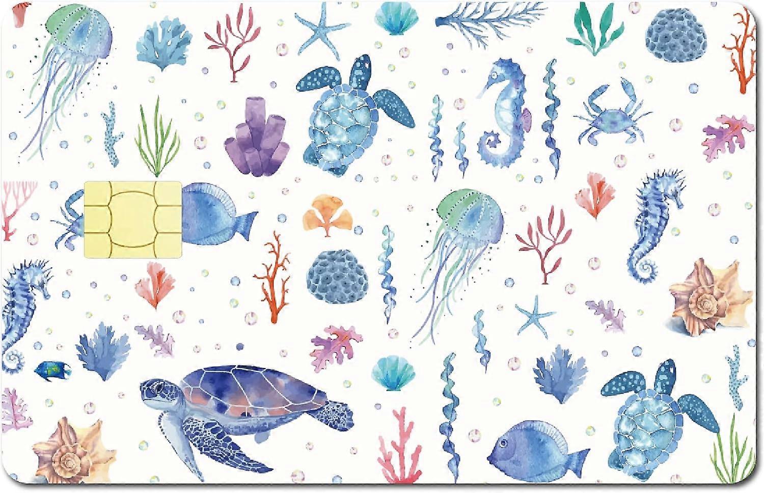 Ocean Animals Card Skin Sticker Turtle Debit Credit Card Skins Covering Personalizing Bank Card Protecting Decals Waterproof Removable No Bubble Slim for Transportation Key Card 7.3x5.4Inch [CARD SKIN STICKER]: Our card skins is turtles, seahorses, jellyfish, corals, seaweed, starfish pattern could protect your credit card and will make your credit card look unique and show your personality. It is about time to preserve the credit/debit card from stealing information. [PVC PLASTIC MATERIAL]: We use the PVC plastic material for these stickers, they are ultra-thin and easy to stick and removable. Additionally, our debit card stickers are produced with waterproof matte finish and proof scratch card skins, not be faded and keep new for a long time. [4 STYLES CHOICES]: The size of the card skin sticker is about 7.3 x 5.4Inch(186.3 x 137.3mm). We provide you with a set of 4 stickers with pre-cut for rectangle microchip: half cover, full cover, full cover w/window, full cover w/chip which fits all types of card of a small chip. [DIFFERENT GIFT]: You can use these card cover as a decoration or a present. On special days, use these card skins to give to your family, husband wife friends your colleagues or anyone you loved so much. You know everyone has a credit card, these card skins will be a gift for someone or yourself. [APPLICATION]: Bank card sticker is also could use for debit card, credit card, transportation card, key card, gift cards, access cards, any types of payment card etc.