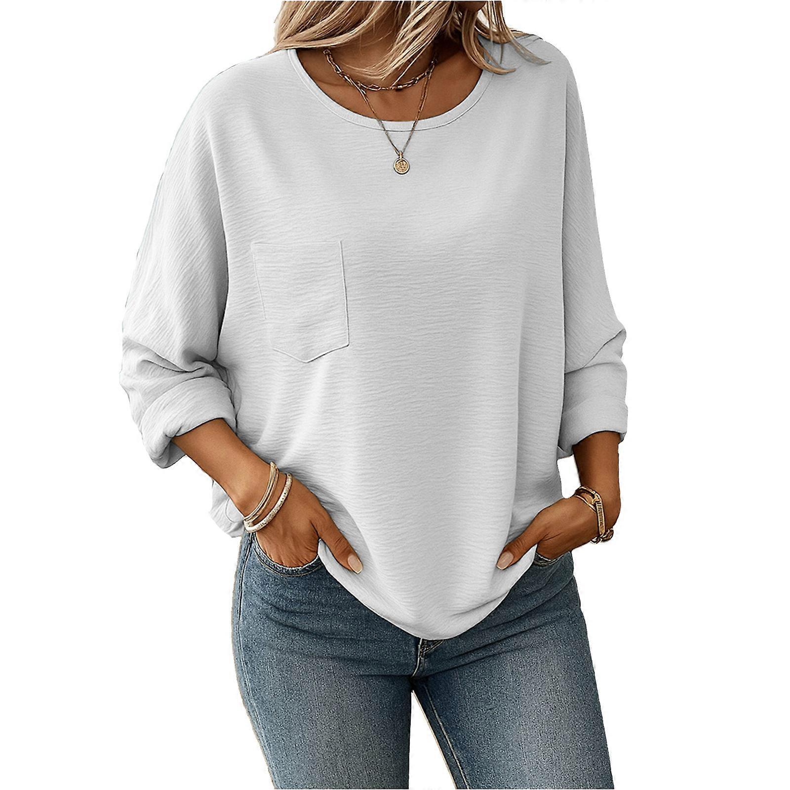 Long Sleeve Shirts for Women Casual Round Neck Tops Loose Fit Fall Winter Clothes with Pocket White XL