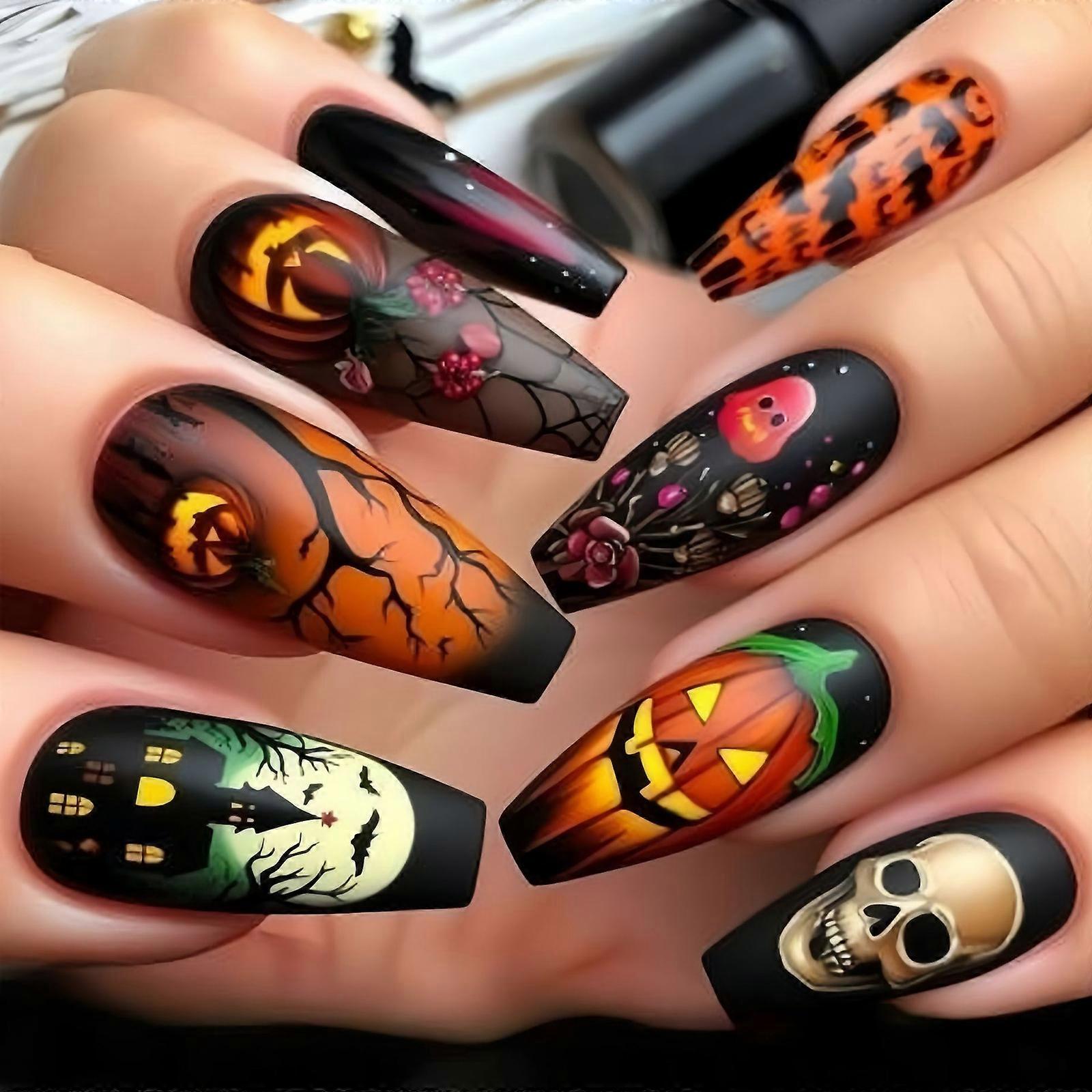 Halloween Detachable False Nail Set Of 24 Pieces Pumpkin Skeleton Web Art For Women Party Daily Wear Multicolor