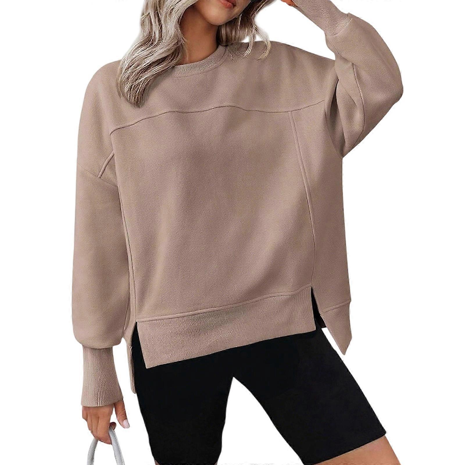 Women's Long Sleeve Sweatshirt With Round Neck And Side Split High Low Design Oversized Pullover Top For Daily Wear Khaki XL