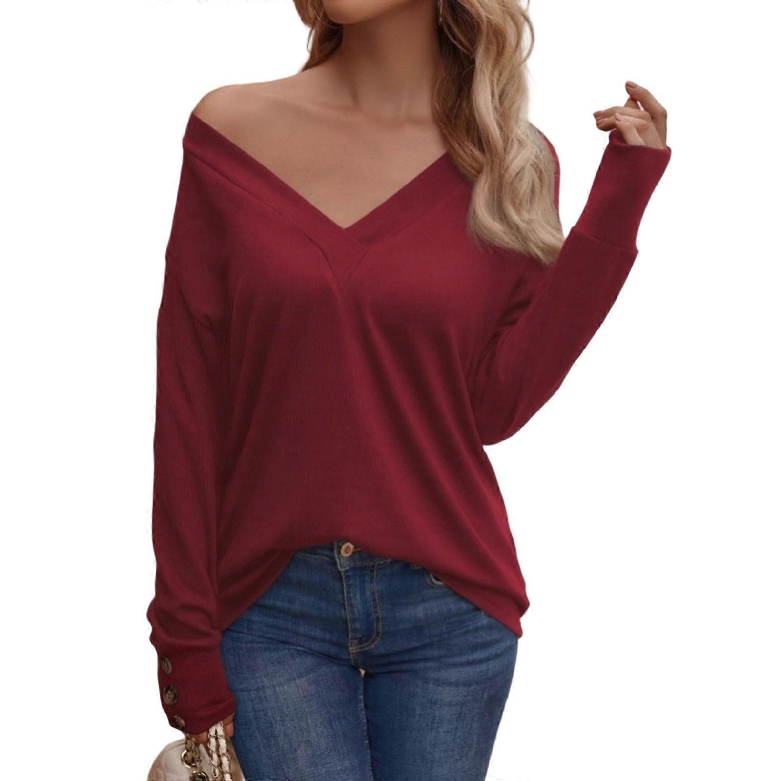 Women Tops V Neck Long Sleeve Shirt Casual Fall Outfits Basic T Shirt Blouses Tops Fashion Tee Tunics Tops Fall Clothing Burgundy XL