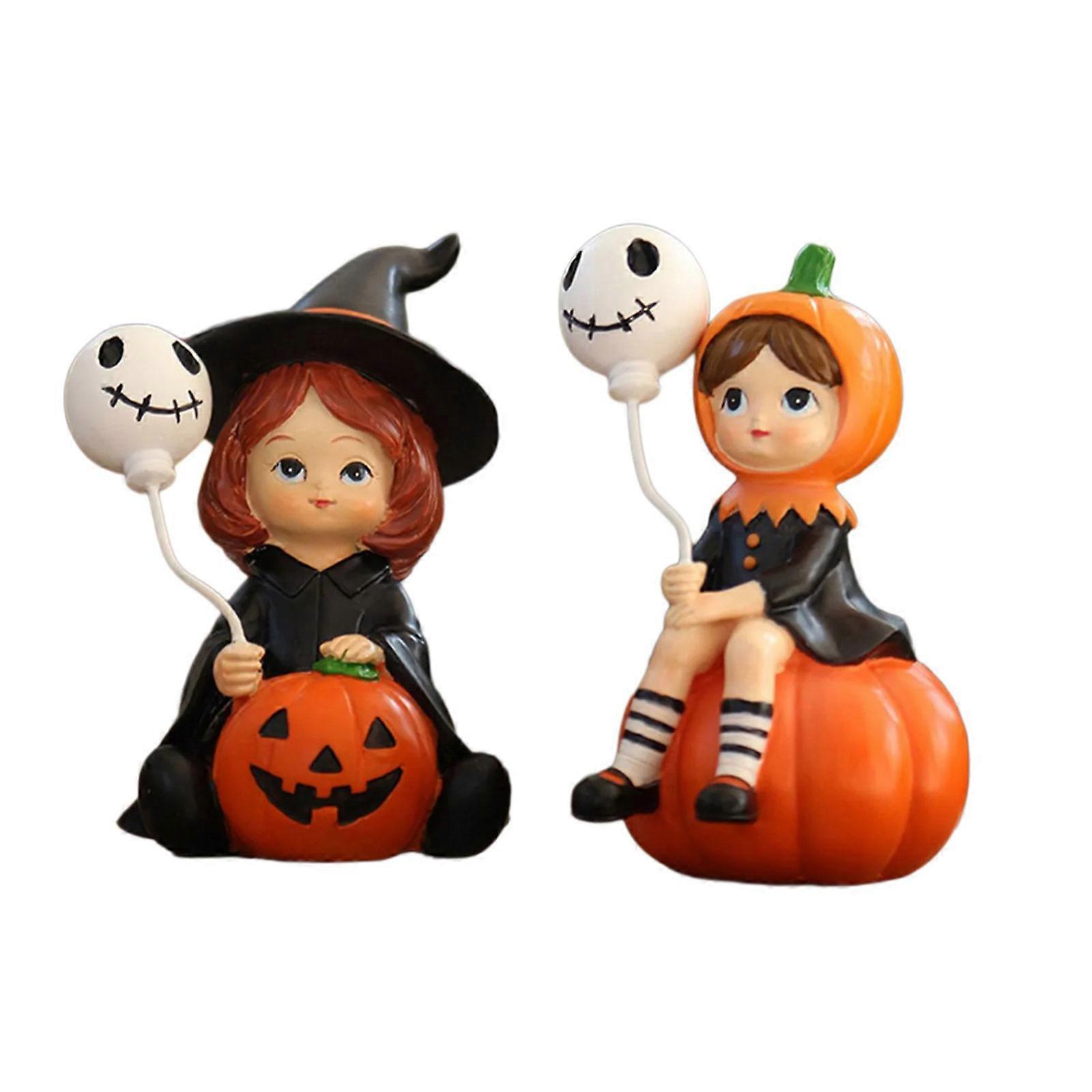Set of 2 Halloween Resins Craft Pumpkin Witch Holding Ghostly Balloon Ornaments For Indoor Themed Party Decoration Piece Multicolor