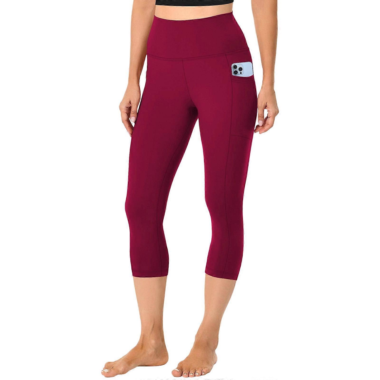 High Waist Cropped Pants with Pocket for Women Cropped Leggings High Waist Sport Cropped Pants for Gym Fitness Workouts Claret XL