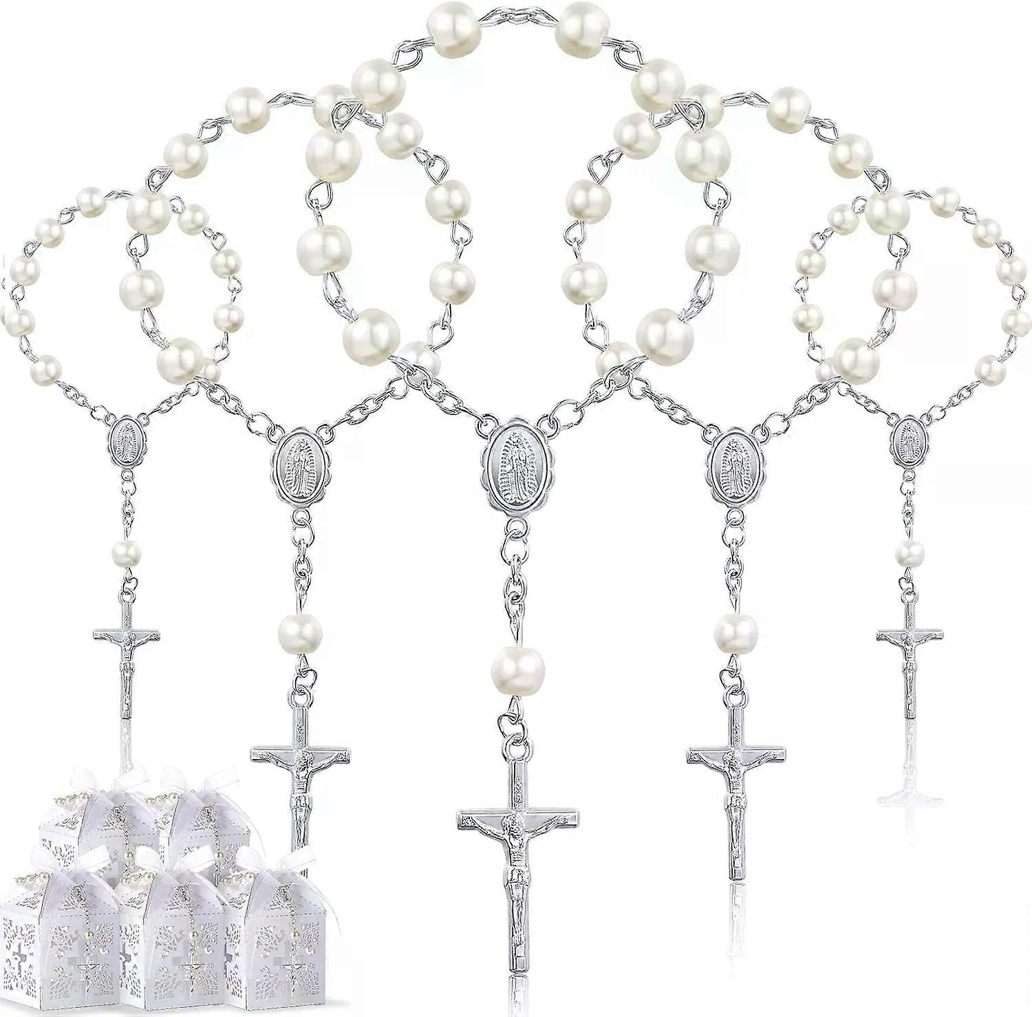 10/20pcs Christening Acrylic Rosary Beads Faux Pearls with Cross Christening Gift Box for Christening Wedding Party Favors