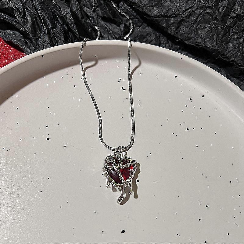 unique Vintage Goth 90s Silver Color Red Peach Heart Pendant Chain Necklace For Women Men Y2K Aesthetic Jewelry Accessories