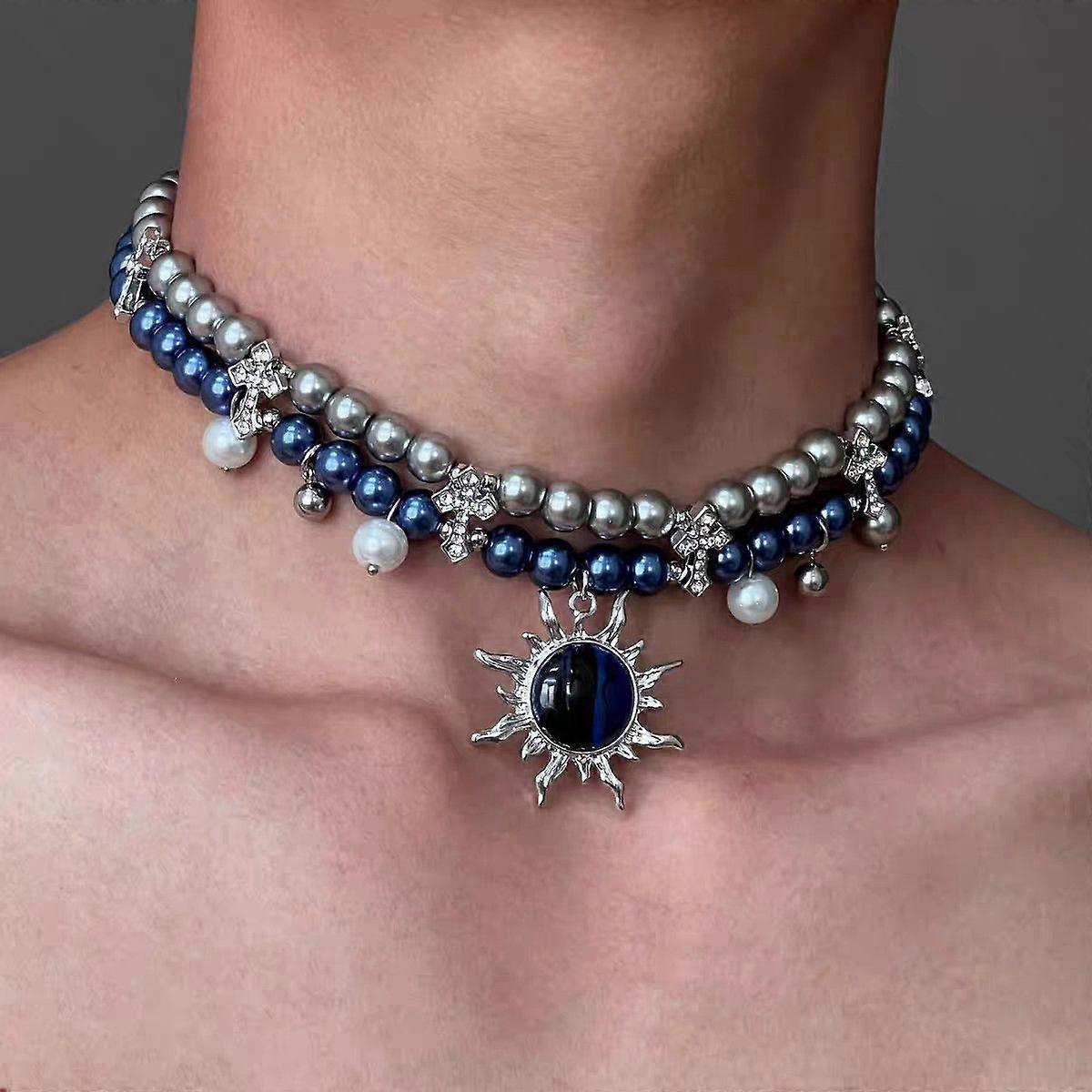 unique New Necklace Blue Beaded Pearl Cross Double-Deck Sun Pendant Unisex Punk Cool Couple Choker for Women Men Jewelry