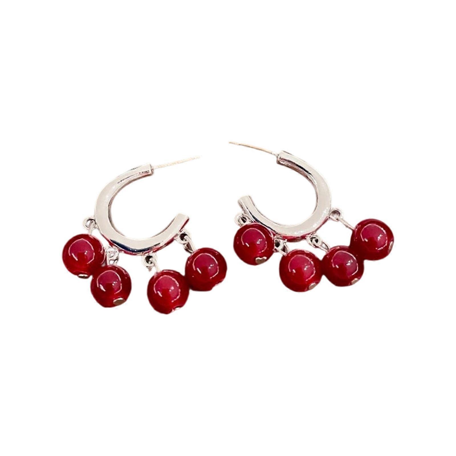 Trendy C Shape Earrings with Bead Pendant Embellishment Artificial Crystal Materials Suitable for Matching Various Looks Red