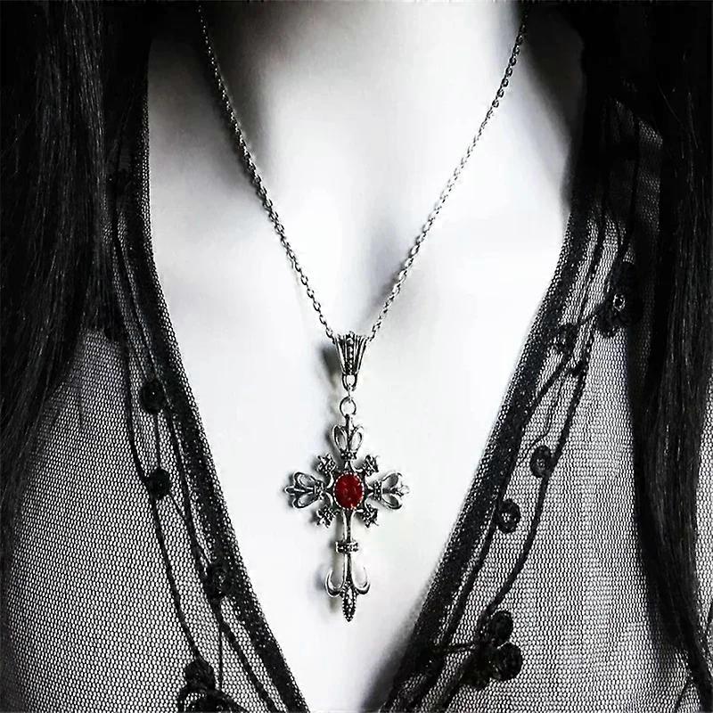 unique Vintage Ruby Cross Necklace Gothic Dark Statement Fashion Pendant Necklace