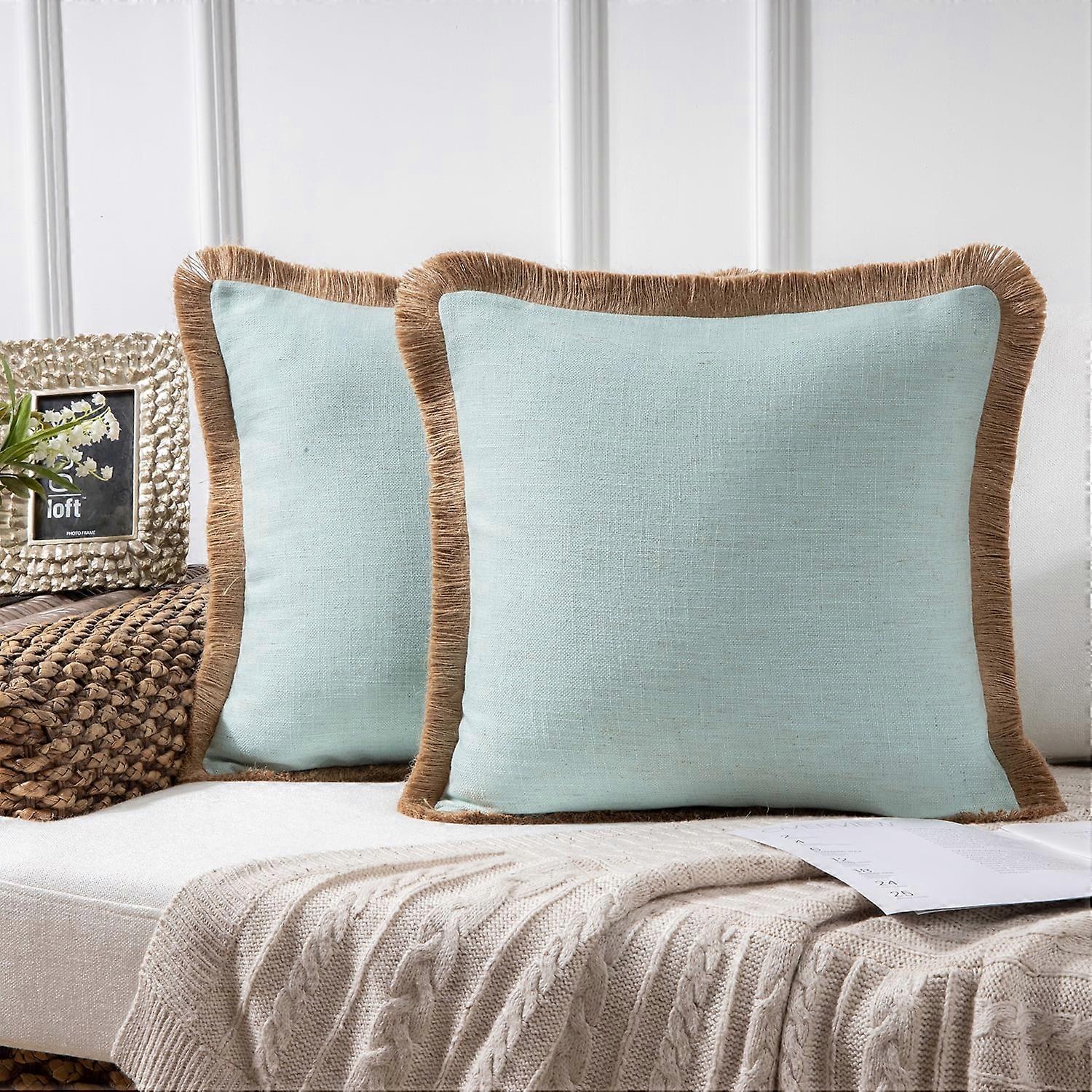 Phantoscope Linen Tassel Trimmed Farmhouse Series Decorative Throw Pillow, 18" x 18", Water Blue, 2 Pack