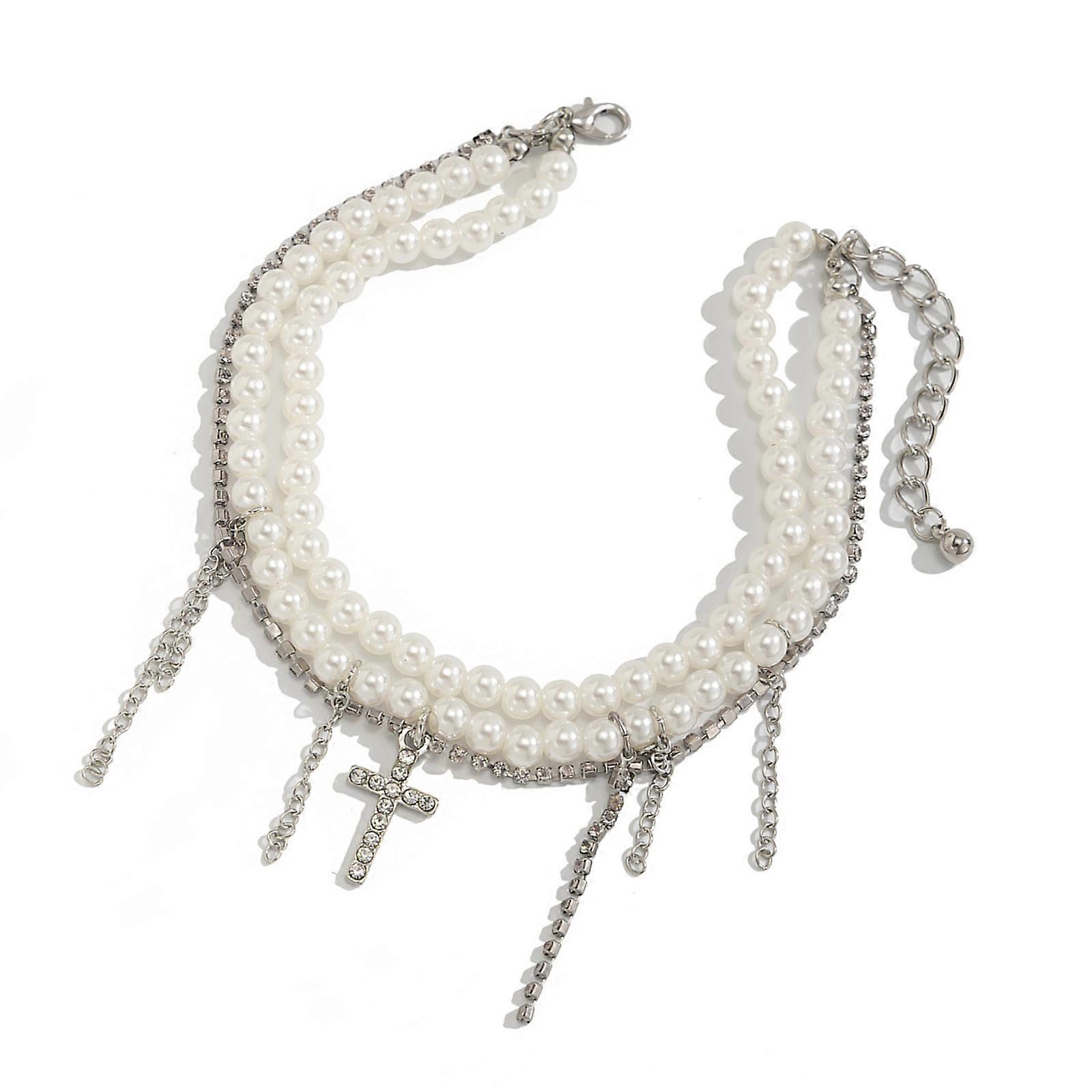 Ankle Bracelets for Women Rhinestones Crosses Pendant Tassels Anklets Beach Summer Foot Jewelry Pearls Chain Anklets Multicolor