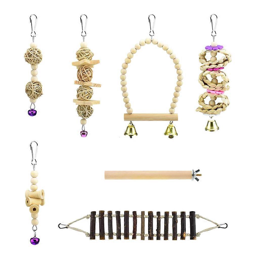 7 Pieces Parrot Nest Snuggle Bird Ladder Swing Hammock Small Pet Bells Wood Stand Small Pet Ladder Blocks Multicolor