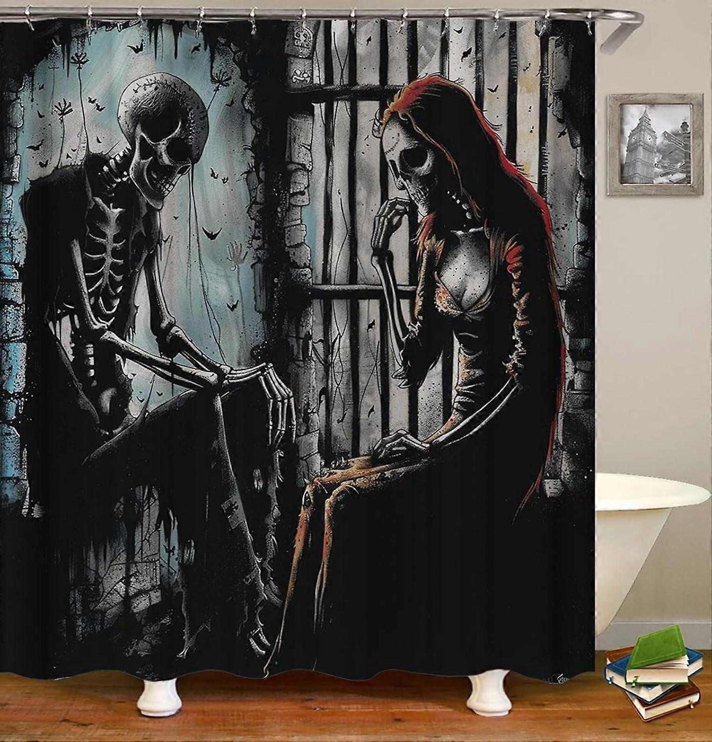 Halloween Shower Curtain Set with Skull & Couple Design, Waterproof Fabric 71" Long, Includes White Plastic Hooks (N2)