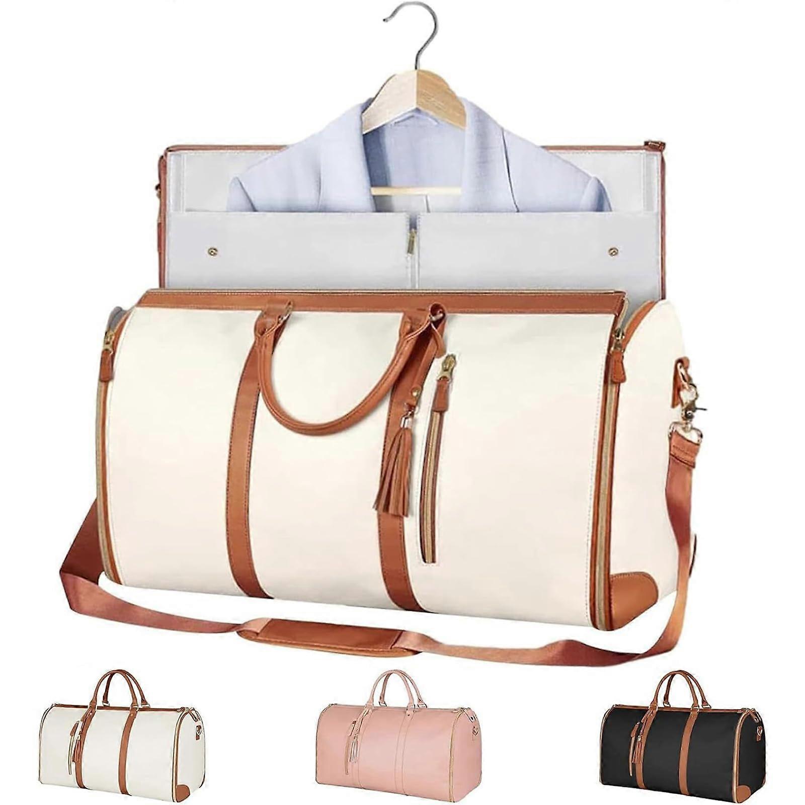 Trendfetchus Foldable Travel Bag 2.0 Versatile twoinone design: Transforms from a garment bag to a luggage bag with a seamless switch, and offers an option for hands travel to meet a range of trip needs. Waterresistant and durable build: Crafted from waterproof Oxford cloth and wearresistant PU leather, it protects contents from rain and daily wear, delivering reliable performance on any trip. Wrinkle organization system: Dedicated compartments for suits, dresses, and delicate items help prevent wrinkles, and a separate shoe bag prevents crosscontamination while keeping belongings neat. Spacious interior for extended travel: A large interior holds up to 10 days of clothing and shoes, maximizing space efficiency for short getaways or longer vacations without clutter. Foldable and practical: Designed to fold when not in use for easy storage and versatile packing. Practical use scenarios: Business trips requiring formalwear, with organized compartments to keep garments wrinkle. Weekend getaways or extended vacations needing a single bag for clothes and shoes, with hands carrying options. Travel in variable weather, where the waterresistant exterior protects contents from rain and daily wear.