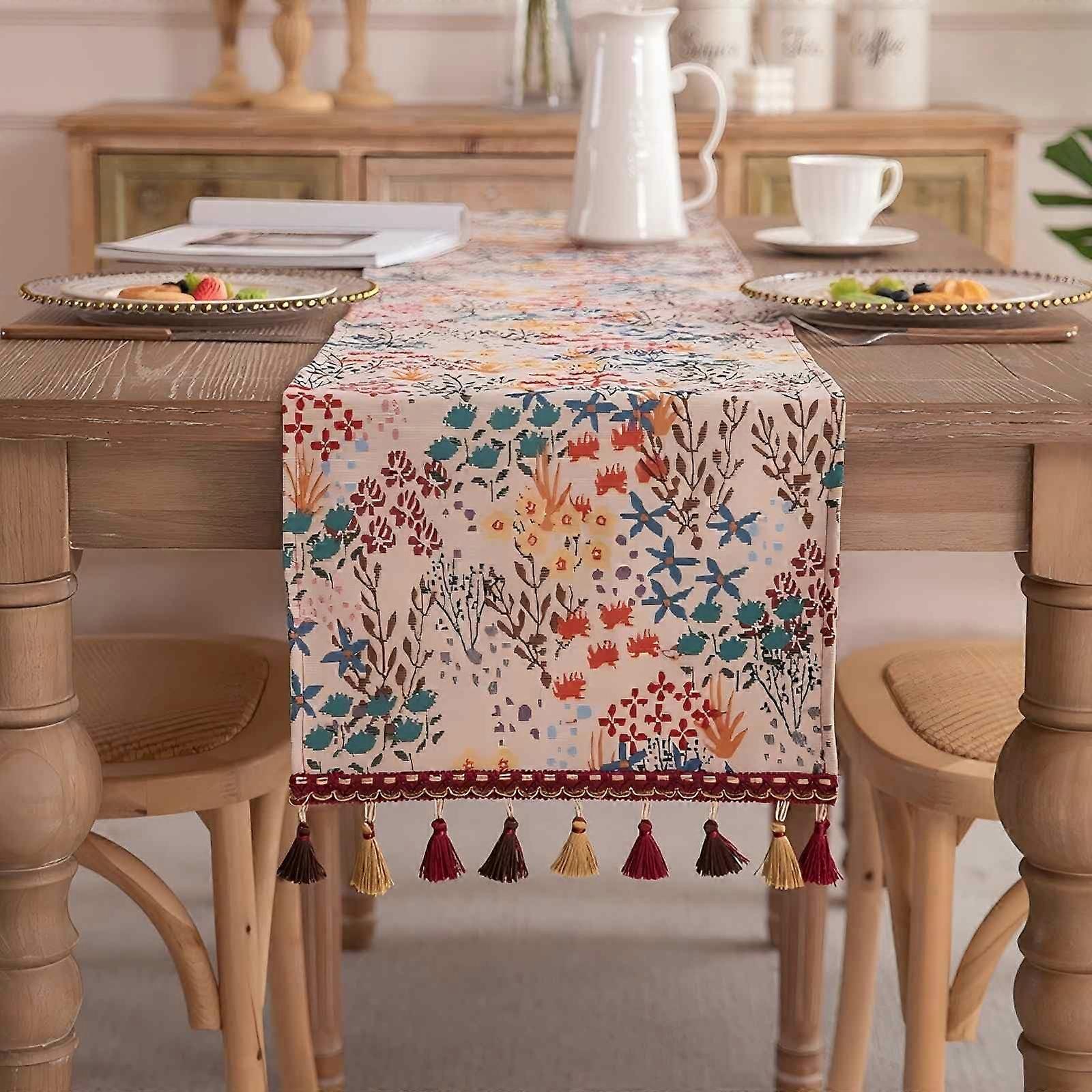 Autumn Table Runner Vintage Floral Coffee Table Runner Tassels 33x180 Cm / 13x72 Inch Indoor Outdoor