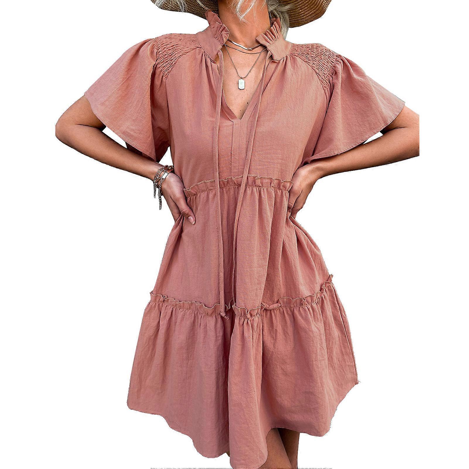 Women V Neck Dresses A Line Ruffle Front Drawstring Short Sleeve Loose Casual Dress for Summer Spring