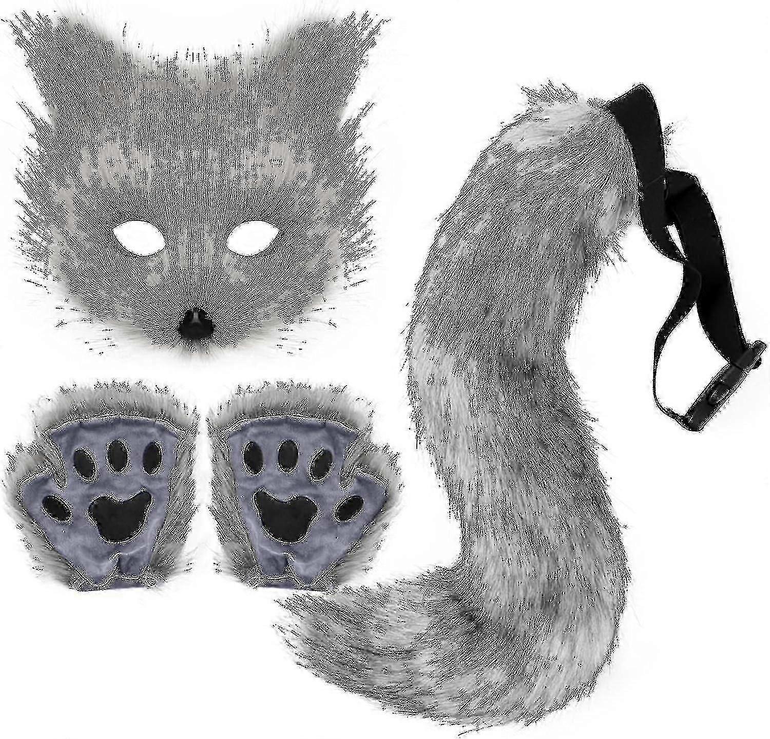 Faux Fur Fox Tail Cat Wolf Cosplay Costume Set Plush Mask Fluffy Paw Gloves Halloween Christmas_Lucky_B