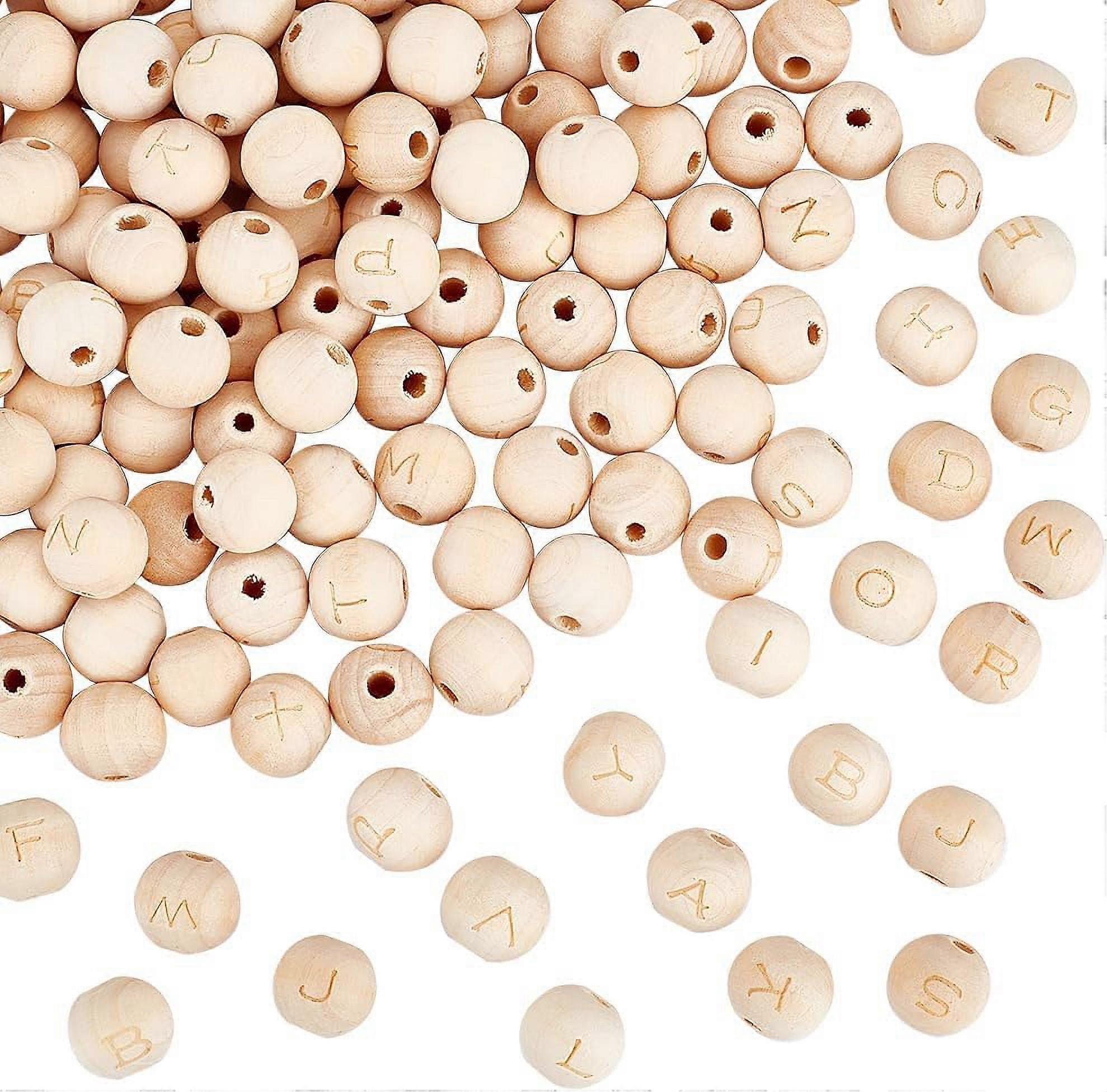130Pcs 14mm Natural Wooden Alphabet Beads, 4mm Hole, Laser Engraved A-Z, Unfinished Undyed Round Beads for DIY Jewelry & Crafts