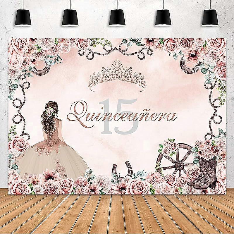 Western Cowgirl Quinceanera 15th Birthday Backdrop, Mexican Fiesta Bday Decor, Floral Crown Boots Watercolor Banner, Horseshoe Photography Background