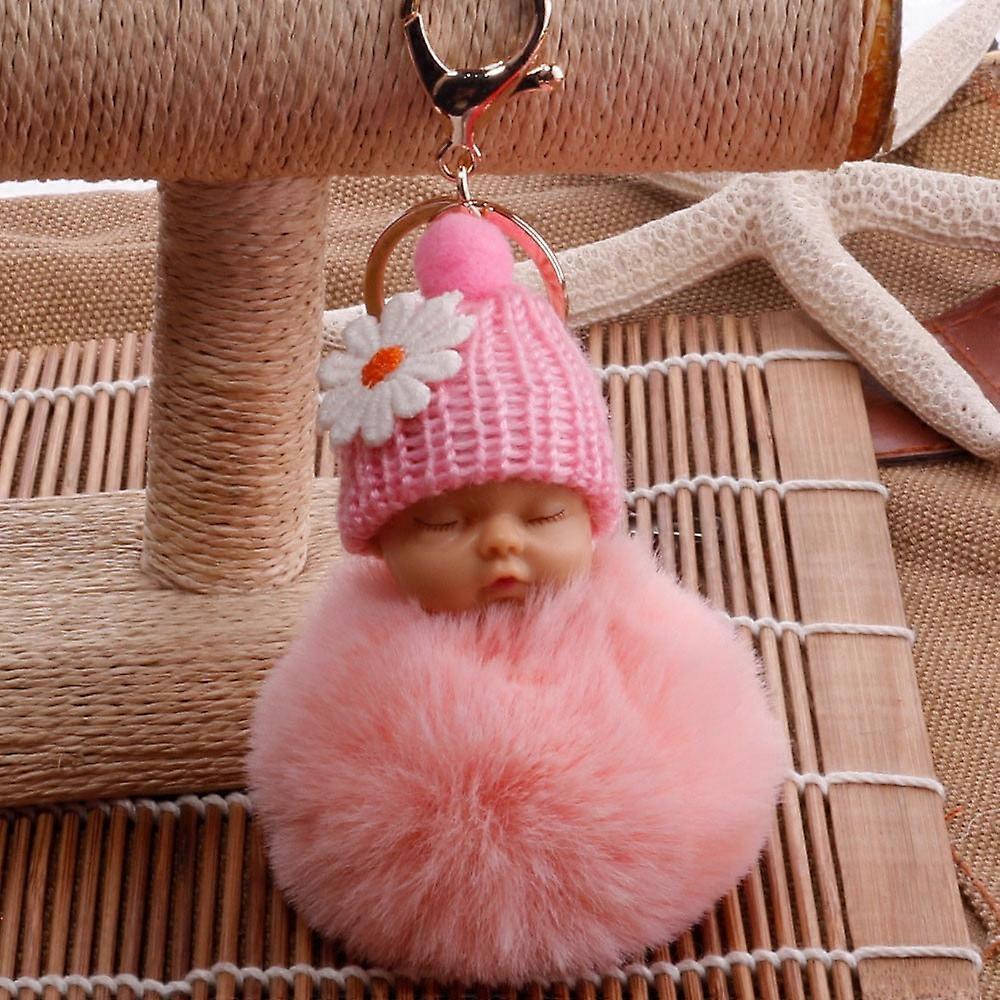YUEHAO Keychains Cute Fur Fluffy PomPom Sleeping Baby Doll Key Chains Keyrings Bags Charm Pendant Pink