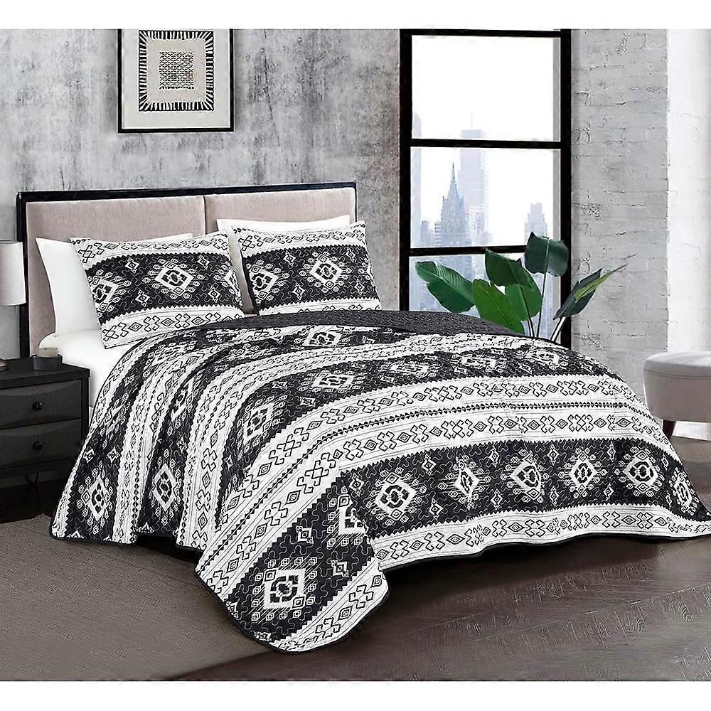 3-Piece Southwestern Aztec Quilt Set - Black White Geometric Symbols Printed Microfiber Lightweight Quilted Bedspread Set, Queen (100" x 95")