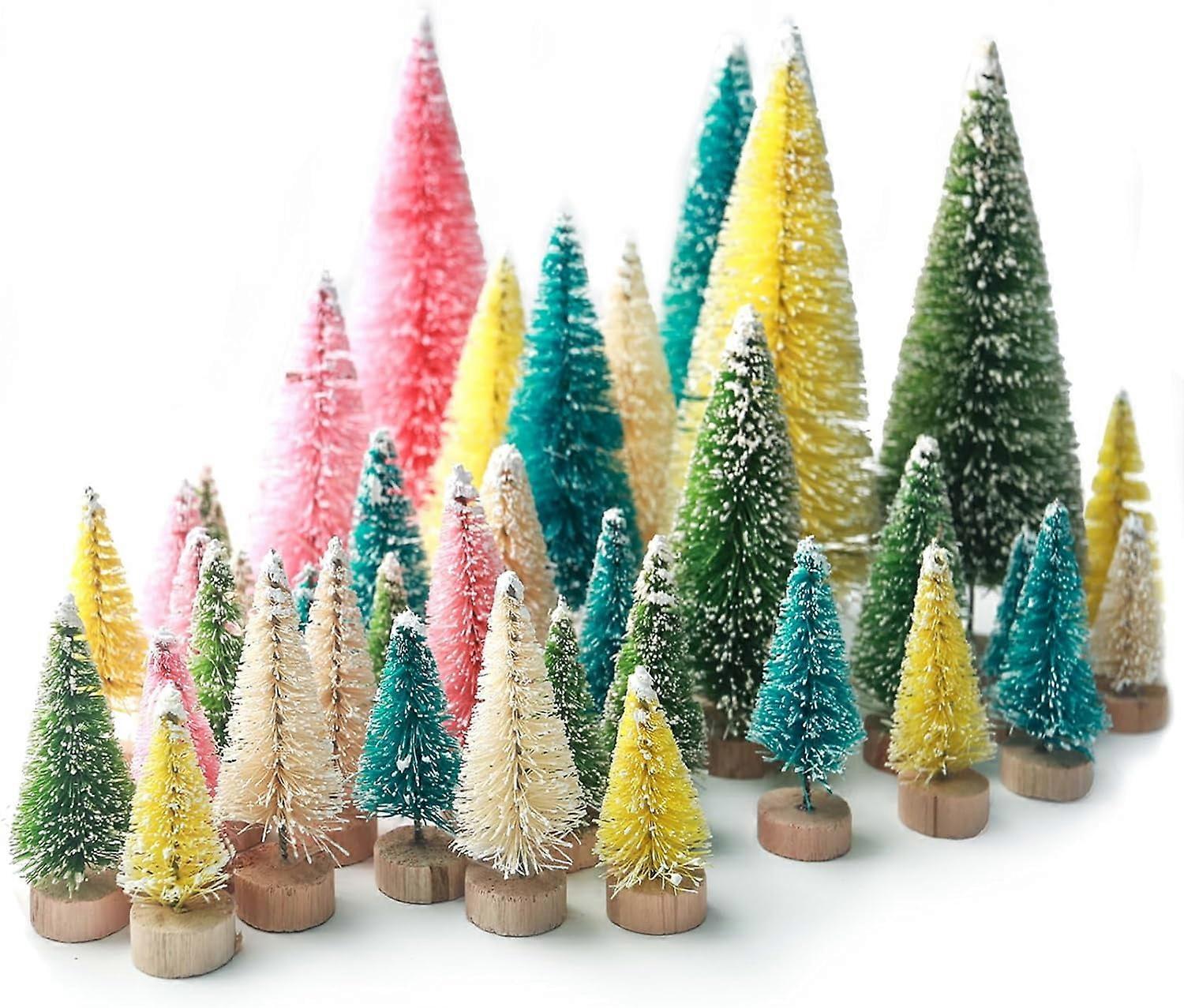 40PCS Colorful Mini Christmas Trees, Snow Frosted Sisal Trees Colored Bottle Brush Xmas Trees with Wooden Base for Xmas Winter Home Table Decoration
