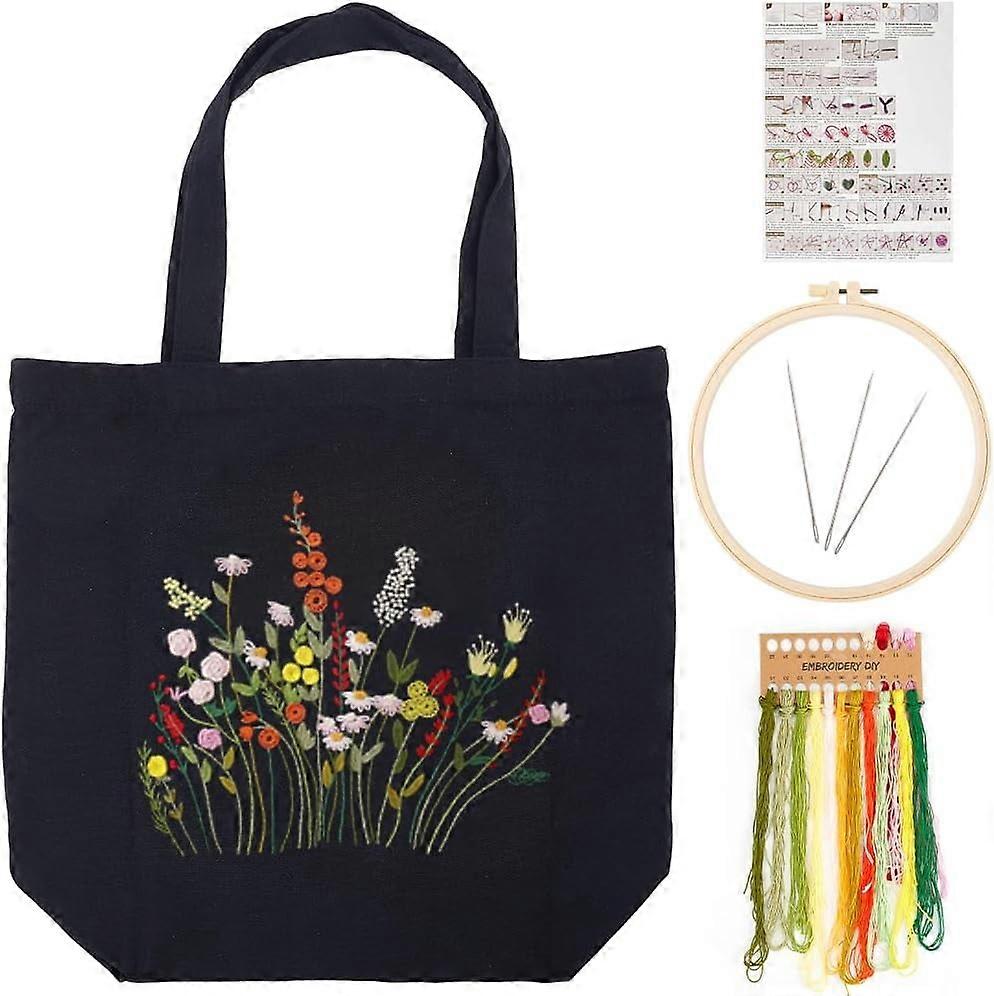 Canvas Tote Bag Embroidery Kit with Flower & Grass Pattern, Cross Stitch for Beginners – Includes Printed Bag, Needle, Hoop, Threads – DIY Sewing