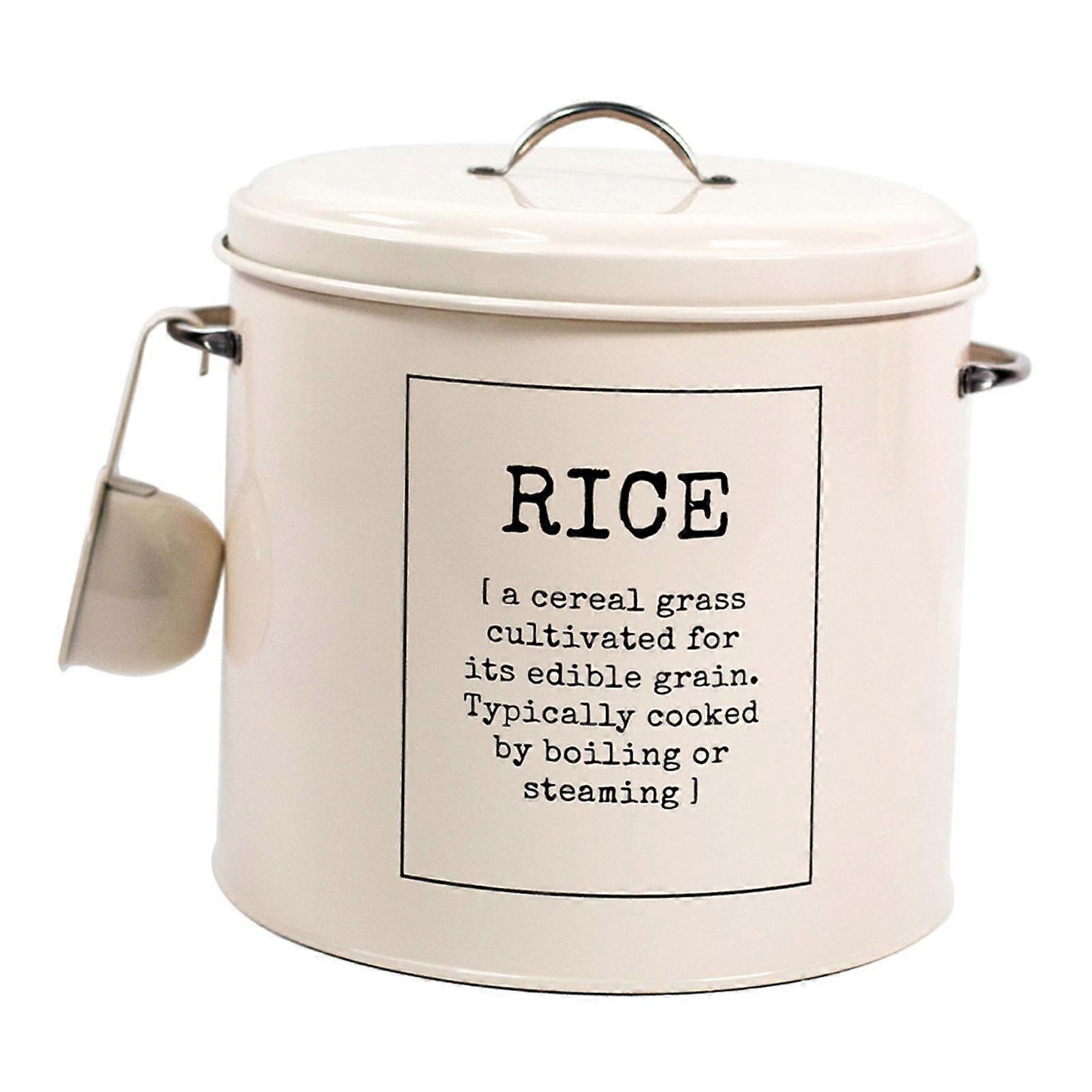Countertop Organizer Jar, Sealed Food Storage Bin Metal Rice Storage Box Iron Rice Container for Grain Pet Food Beans Soybean Style B.Rice storage container comes with measuring spoon, measures 10.16inchx9.45inch. It can hold up to 5kg of rice.Our metal rice container is designed with a fitted airtight lid to ensure contents stay dry and fresh longer.Rice Canister is made from iron that won't deform easily and won't break with prolonged use. Even naughty pets won't be able to break the container.The rice container comes with a metal spoon that can hang on the side for easy transfer of food The metal carrying handle is easy to grip when in use. Easy to clean, simply wipe with a damp cloth.The kitchen storage containers are also suitable for storing many kinds of dry food and baking supplies, such as sugar, rice, grain, chips, cereals, nuts, beans, snacks, pasta, coffee, well as pet foodMetal Rice Storage Box for Kitchen Flour Soybean. Iron Round Rice Container with Lid and handle. Sealed Food Storage Bin Countertop Organizer Jar. Rice Canister with Lid and Measuring Spoon. Countertop Sealed Food Storage Container for Rice. [Sturdy and Durable]: Rice Canister is made from iron that won't deform easily and won't break with prolonged use. Even naughty pets won't be able to break the container. [ Fresh]: Our metal rice container is designed with a fitted airtight lid to ensure contents stay dry and fresh longer. [Size]: Rice storage container comes with measuring spoon, measures 10.16inchx9.45inch. It can hold up to 5kg of rice. [Easy to Use]: The rice container comes with a metal spoon that can hang on the side for easy transfer of food The metal carrying handle is easy to grip when in use. Easy to clean, simply wipe with a damp cloth. [Versatile Uses]: The kitchen storage containers are also suitable for storing many kinds of dry food and baking supplies, such as sugar, rice, grain, chips, cereals, nuts, beans, snacks, pasta, coffee, well as pet food