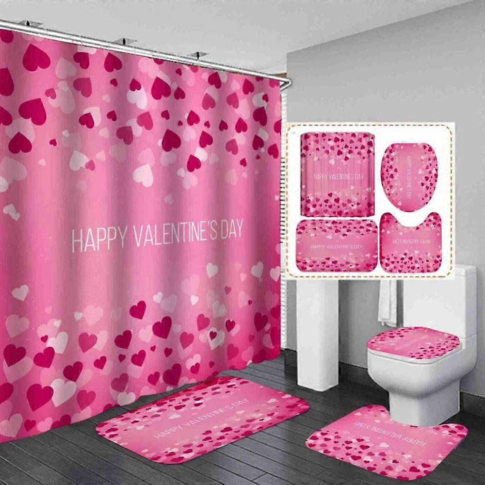 4 Pcs Valentine's Day Shower Curtain Set with Rugs (U-Shaped Bath Mat, Toilet Lid Cover) & 12 Hooks compatible with standard showers